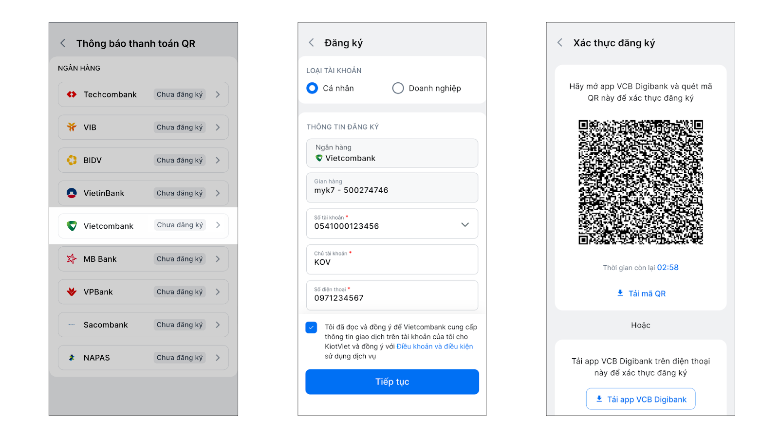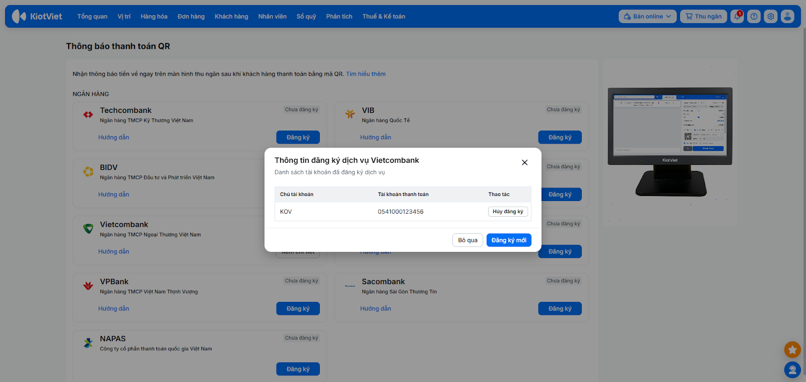 - Một gian hàng KiotViet có thể liên kết với nhiều tài khoản Vietcombank.