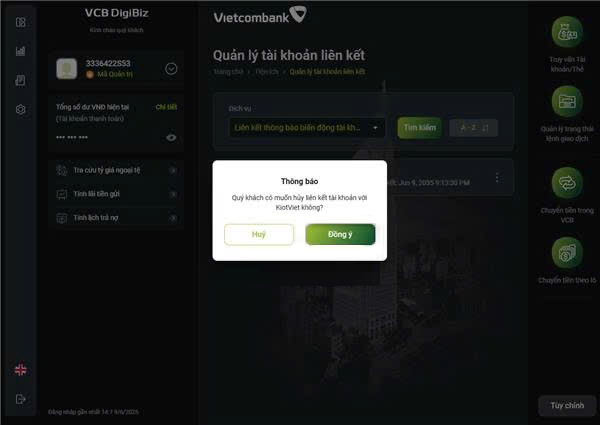 - Chọn dịch vụ Liên kết thông báo biến động tài khoản, chọn tài khoản KIOTVIET và nhấn 3 chấm → Hủy liên kết.