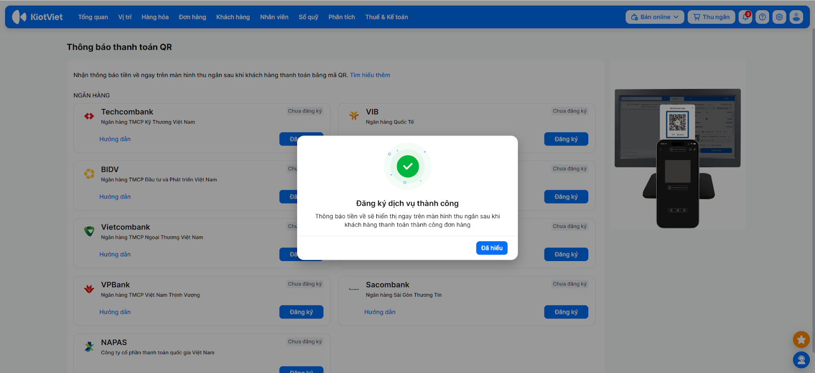 Khi khách hàng thực hiện thanh toán, hệ thống sẽ tự động hiển thị kết quả ngay trên màn hình Thu ngân để bạn xác nhận.