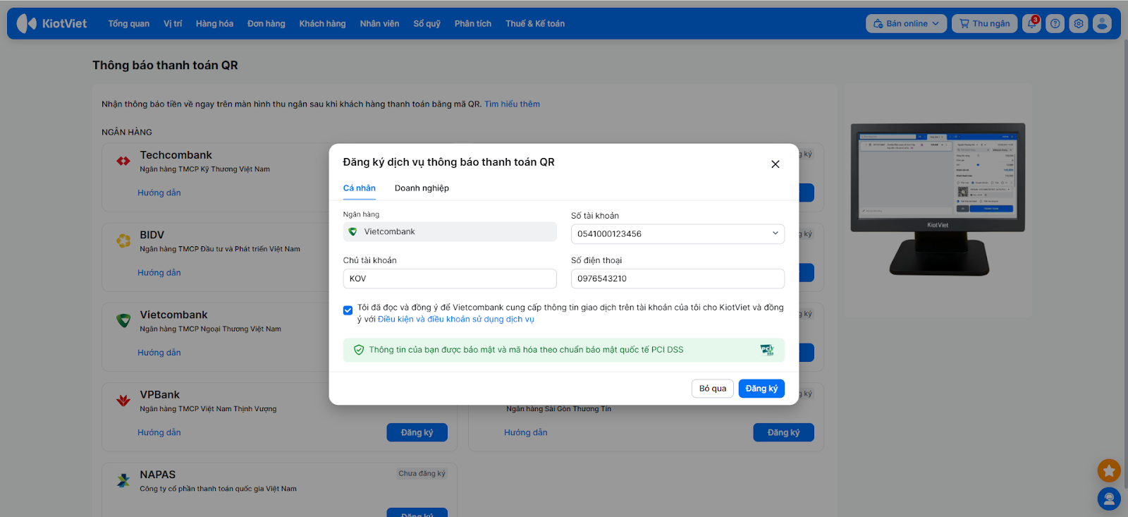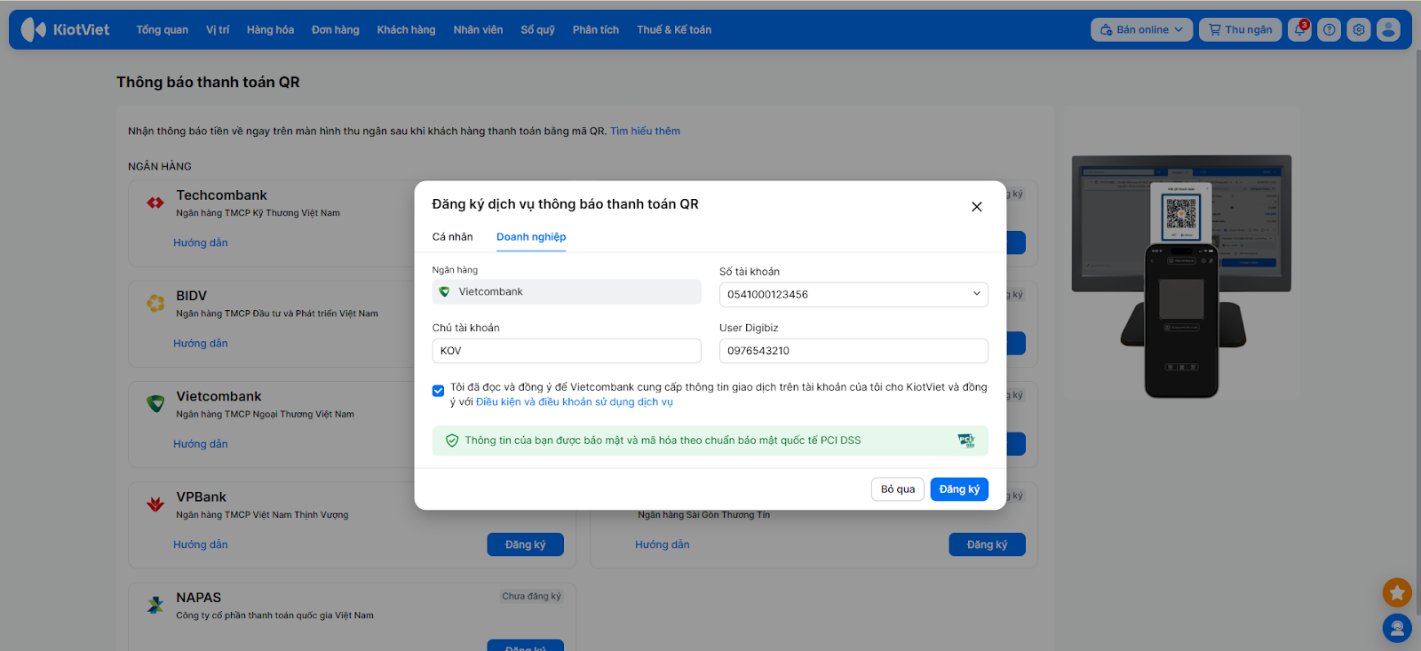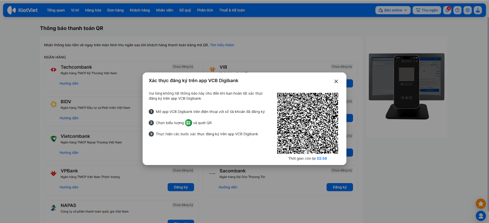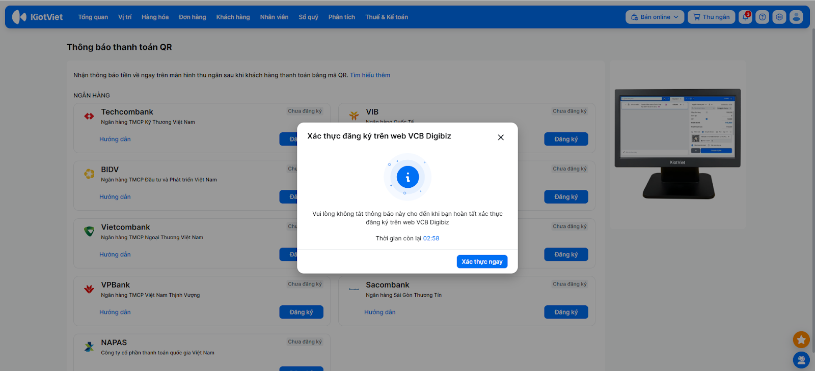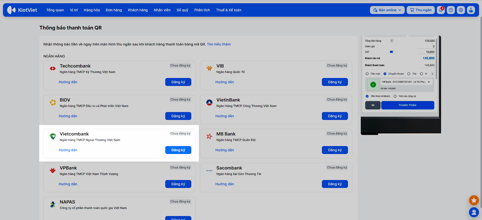 Để kích hoạt tính năng nhận thông báo thanh toán tự động, bạn cần hoàn tất việc đăng ký dịch vụ trên KiotViet và xác thực liên kết trên nền tảng của Vietcombank.