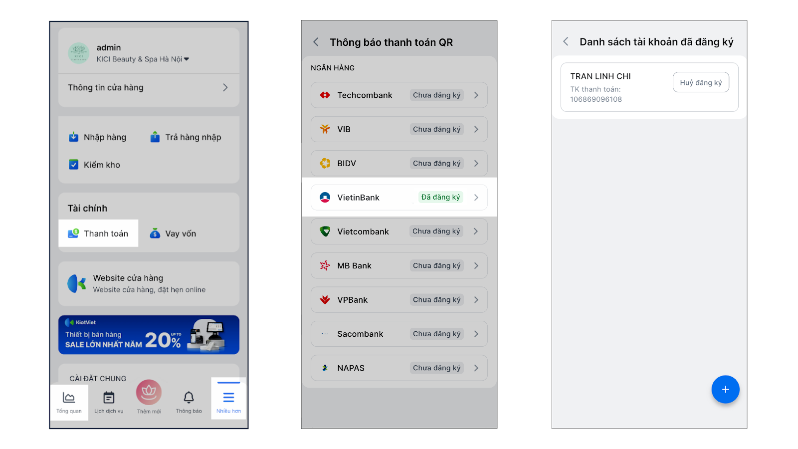 Giúp chủ spa/salon và quản lý: Dễ dàng đăng ký và quản lý nhiều tài khoản VietinBank trên cùng một gian hàng, giúp việc đối soát và theo dõi dòng tiền trở nên đơn giản và tập trung.