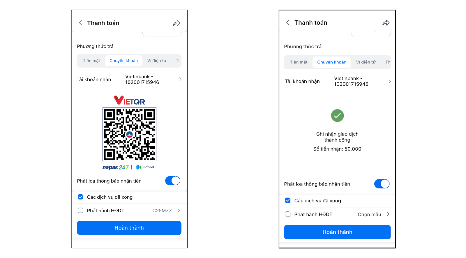 - Tự động thanh toán hóa đơn khi chuyển khoản thành công: Hóa đơn được tự động thanh toán ngay khi hệ thống ghi nhận giao dịch thành công qua mã QR của đơn hàng, giúp tiết kiệm thao tác cho nhân viên.