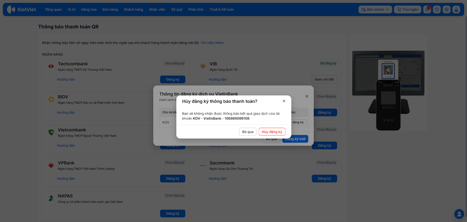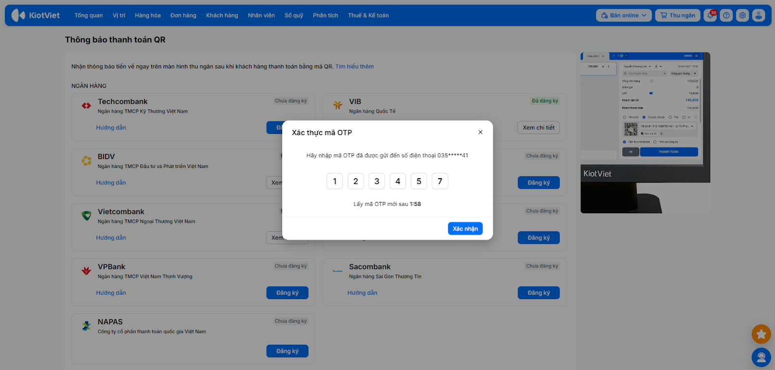 Để kích hoạt tính năng nhận thông báo thanh toán tự động, bạn cần đăng ký dịch vụ trực tiếp trên phần mềm KiotViet và xác thực bằng mã OTP.