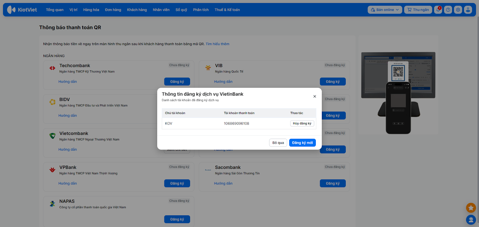 - Tình huống: Khi bạn cần kiểm tra lại thông tin các tài khoản VietinBank nào đang được kết nối để nhận thông báo tự động trên KiotViet.