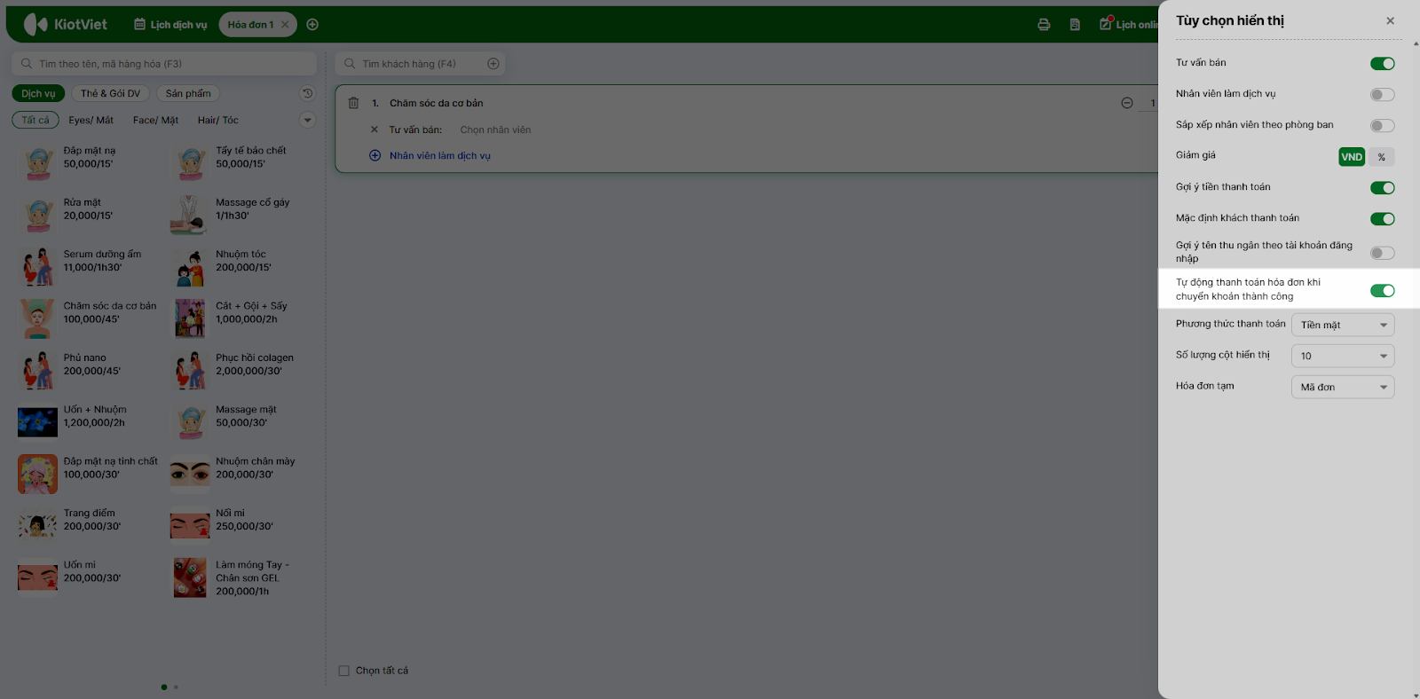 - Tự động hoàn thành hóa đơn khi chuyển khoản thành công qua tài khoản ngân hàng đăng ký nhận thông báo thanh toán QR của KiotViet (bật xanh tính năng Tự động hoàn thành hóa đơn trong Nhiều hơn → Thiết lập bán hàng).