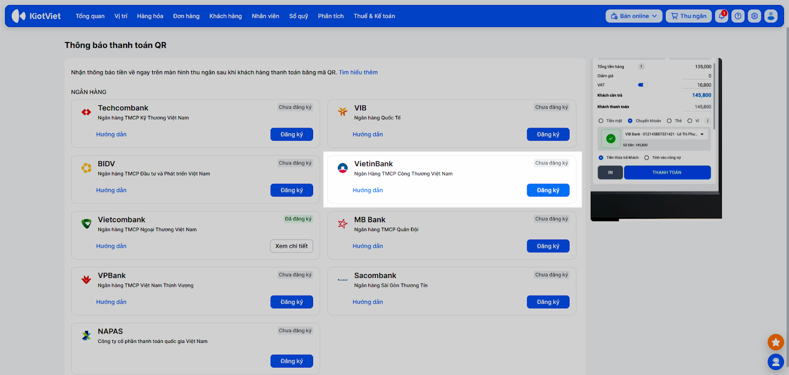 - Một gian hàng KiotViet có thể liên kết với nhiều tài khoản VietinBank.