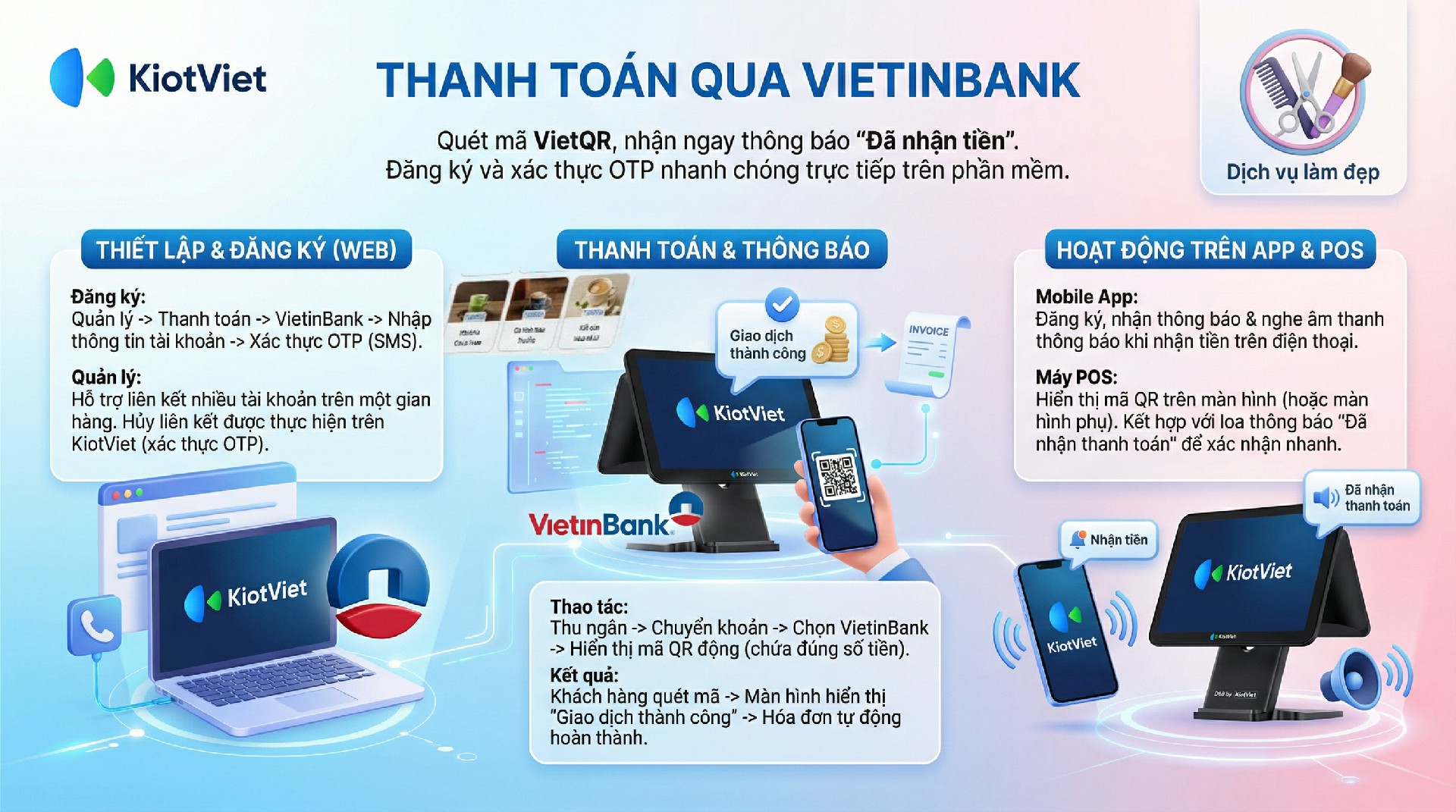 Nhằm hỗ trợ các spa, salon thúc đẩy việc thanh toán phi tiền mặt, KiotViet kết hợp cùng ngân hàng VietinBank đã ra mắt tính năng thanh toán chuyển khoản bằng phương pháp quét mã VietQR và nhận thông báo kết quả ngay trên phần mềm.