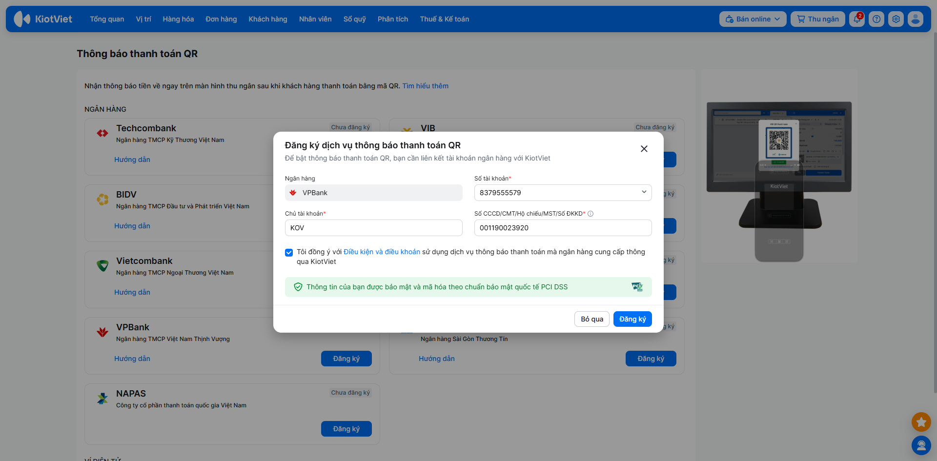 Để kích hoạt tính năng nhận thông báo thanh toán tự động, bạn cần đăng ký dịch vụ trực tiếp trên phần mềm KiotViet và xác thực bằng mã OTP.