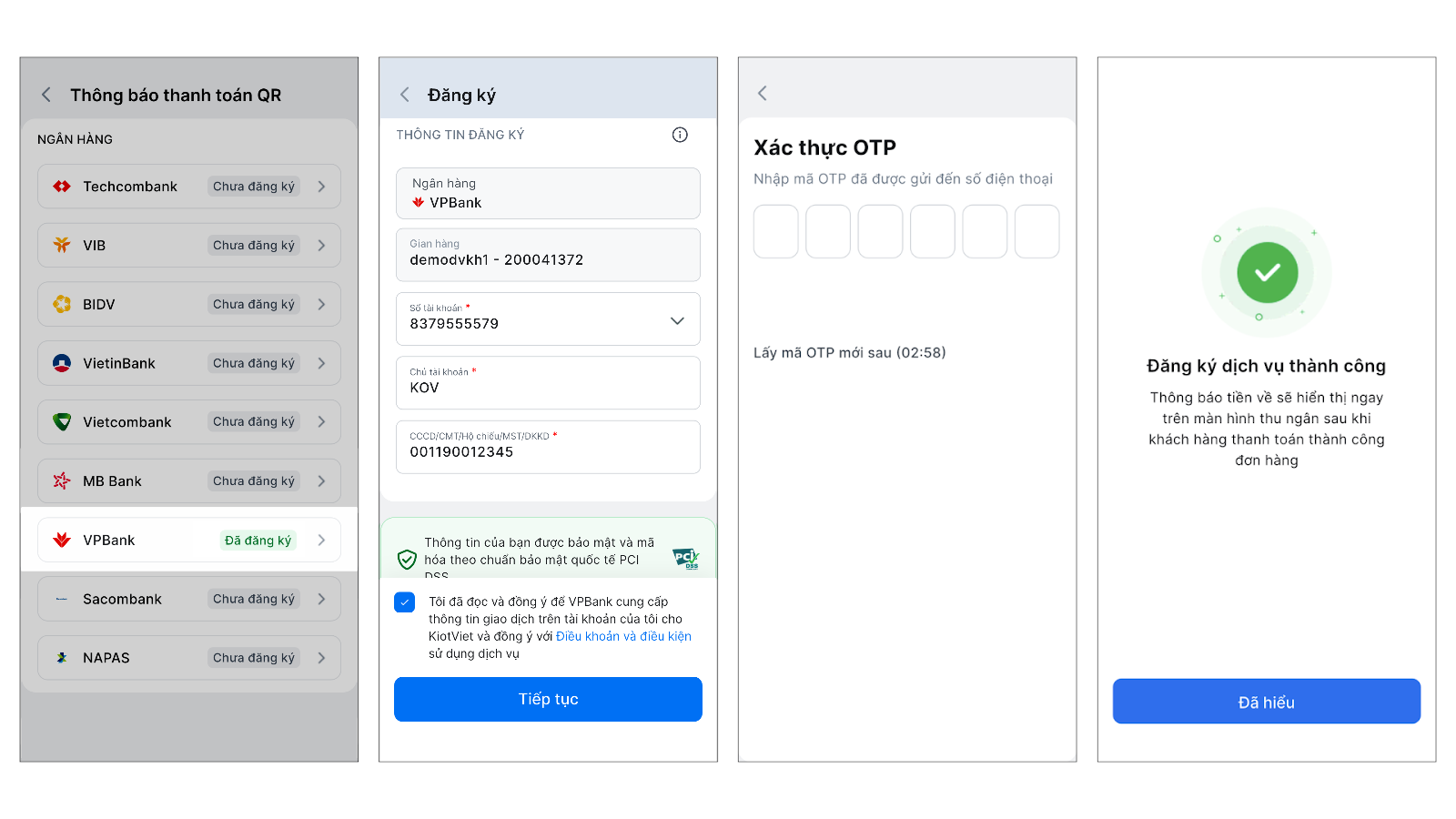 Đối tượng áp dụng: Tất cả gian hàng trên KiotViet (bao gồm cả gian hàng dùng thử và gian hàng chính thức) có tài khoản cá nhân hoặc hộ kinh doanh tại ngân hàng VPBank.