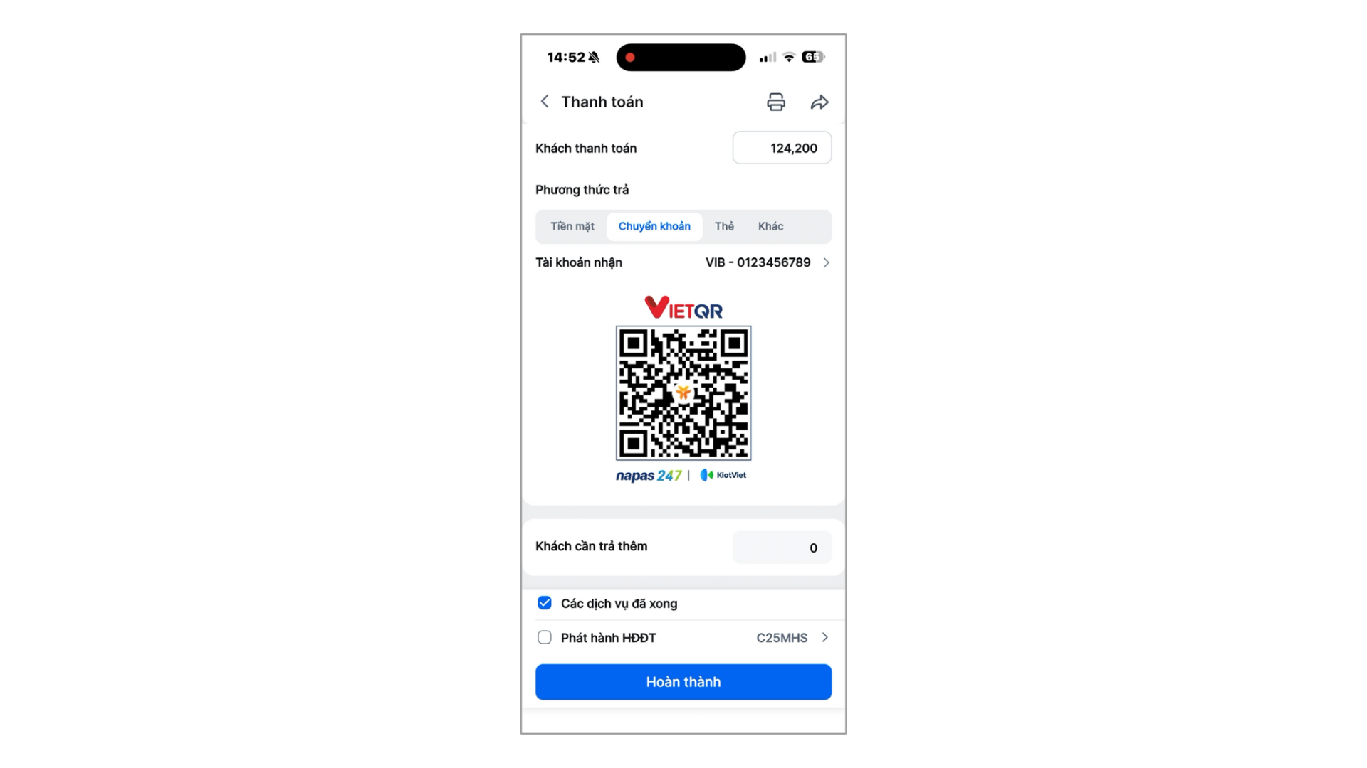 - Tính năng: Hiển thị mã QR động, bao gồm thông tin tài khoản và chính xác số tiền của hóa đơn.