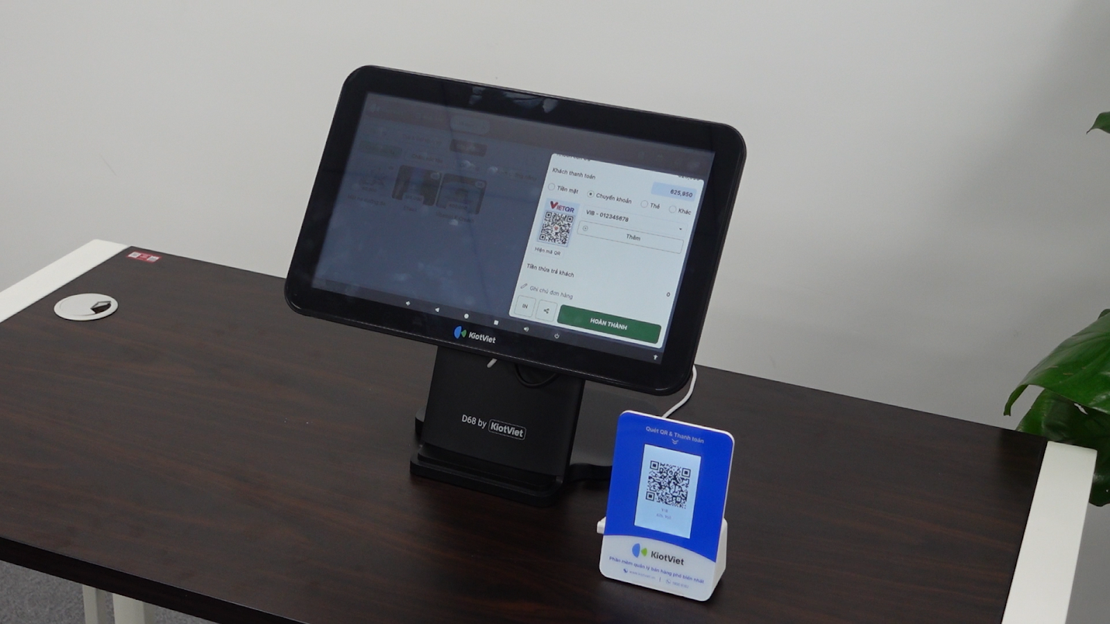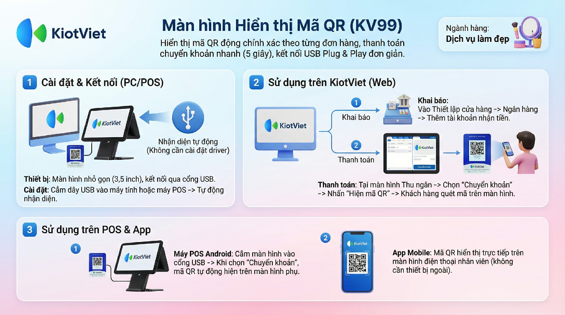 - Giải pháp: Bạn không cần kết nối với màn hình hiển thị QR vật lý. Ứng dụng KiotViet Salon đ&ã; tích hợp sẵn tính năng hiển thị mã QR ngay trên màn hình điện thoại của nhân viên để khách hàng quét trực tiếp.