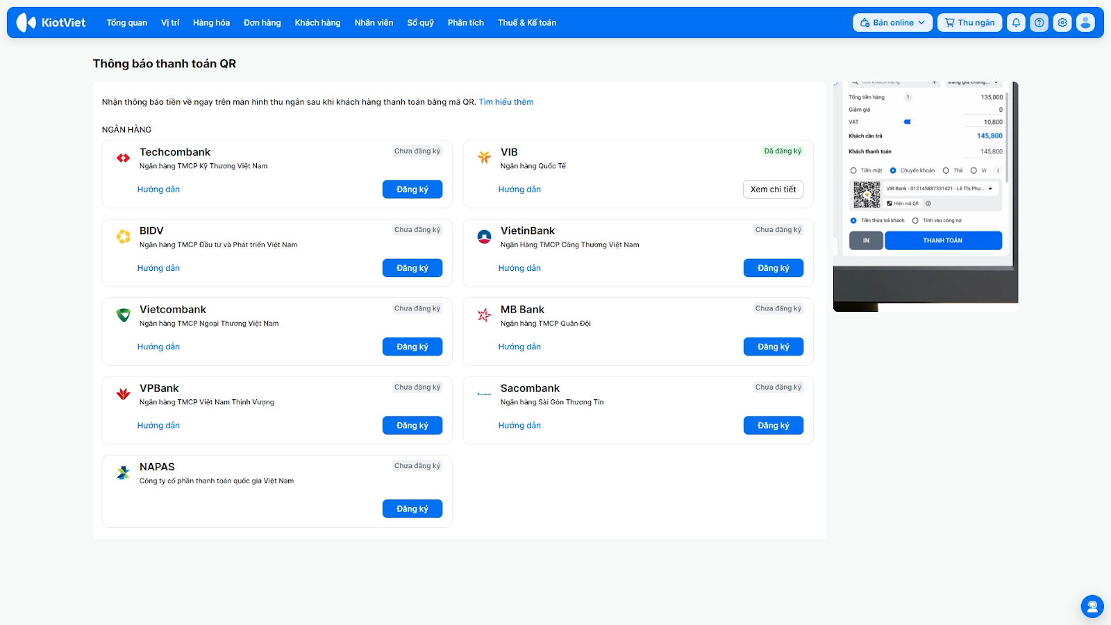 - Để sử dụng, bạn cần kích hoạt tính năng này. Vui lòng tham khảo hướng dẫn chi tiết tại website Hỗ trợ KiotViet, mục “Thanh toán”.