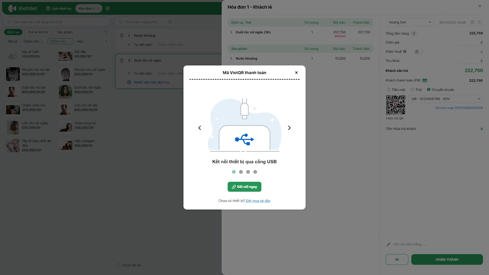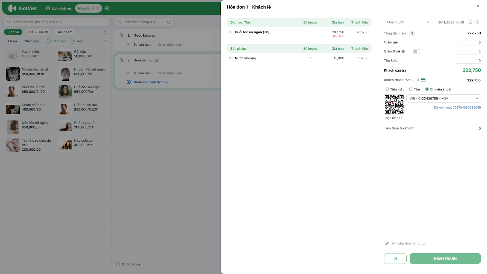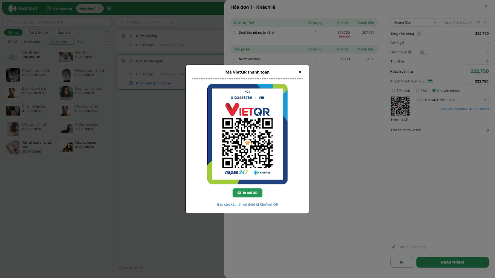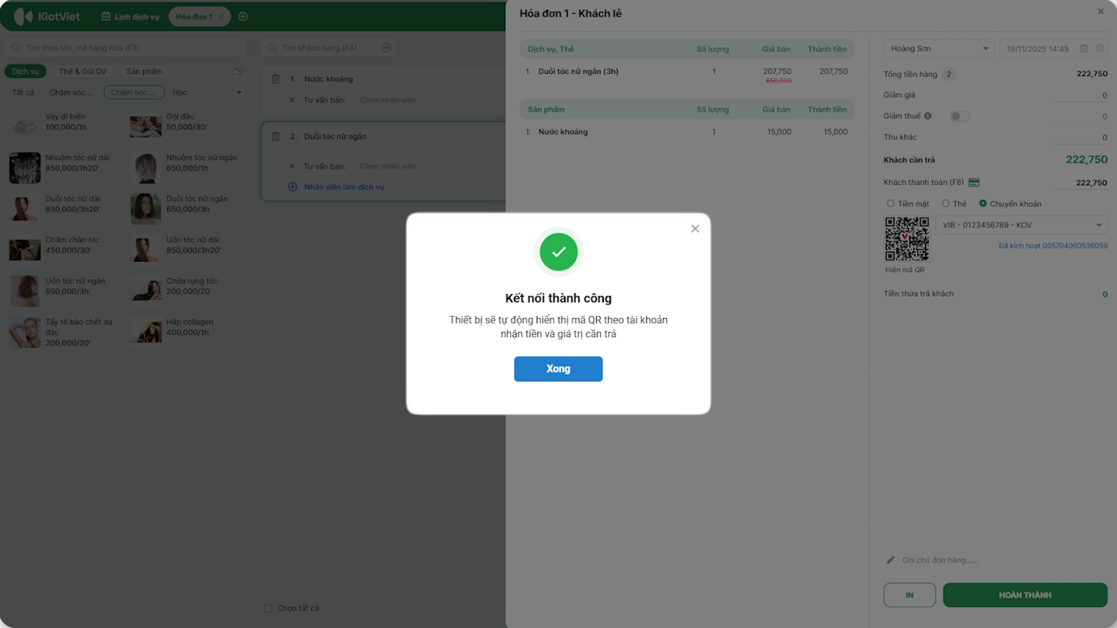- Tình huống: Khi nhân viên/kỹ thuật viên dùng ứng dụng KiotViet Salon để tạo hóa đơn và khách muốn thanh toán qua QR code ngay tại giường dịch vụ.
