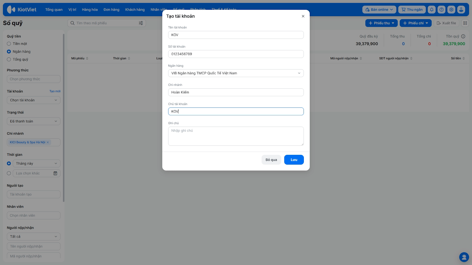 - Tình huống: Để màn hình có thể tạo mã QR với đúng thông tin của spa/salon, trước tiên bạn cần khai báo tài khoản ngân hàng sẽ nhận tiền trên phần mềm KiotViet.