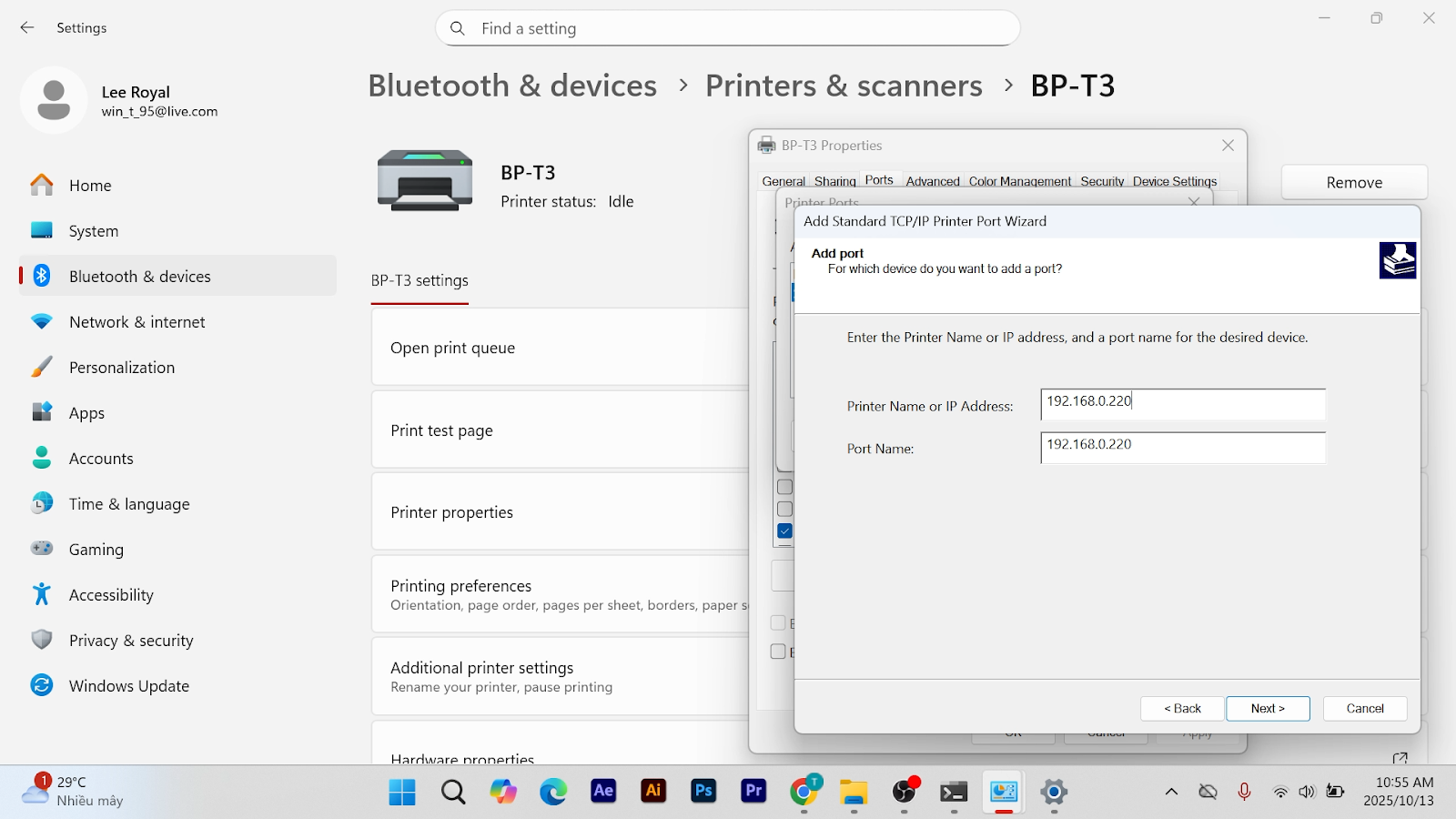 - Nhập địa chỉ IP cố định của máy in (ví dụ: 192.168.0.220) và làm theo các bước hướng dẫn để hoàn tất.