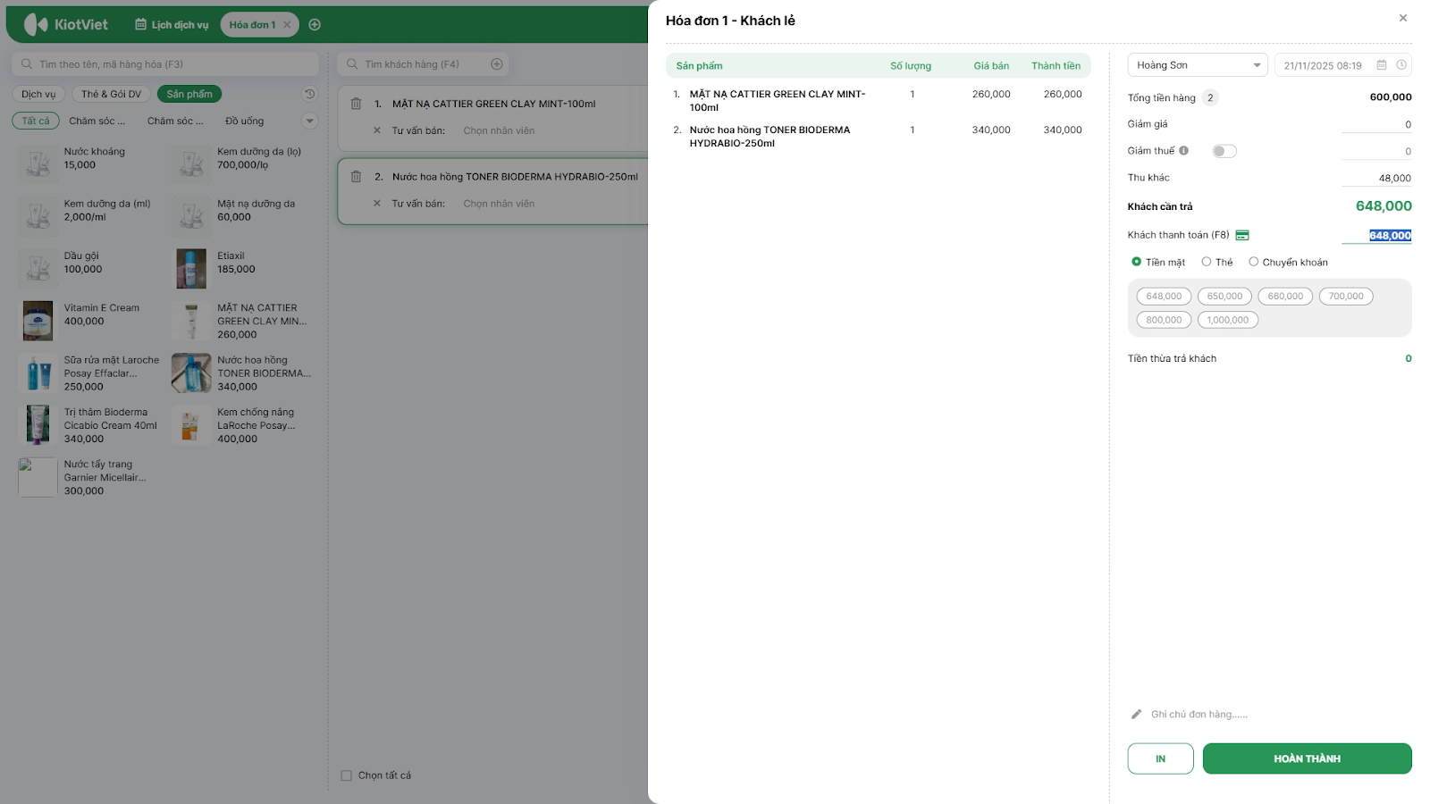 - Trên Màn hình Lễ Tân KiotViet, thêm dịch vụ/sản phẩm vào hóa đơn và nhấn Hoàn Thành.
