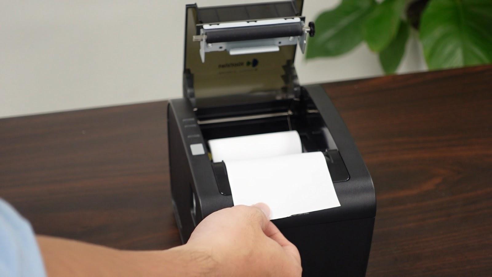 - Đặt cuộn giấy in nhiệt K80 vào máy sao cho mặt giấy in hướng lên trên.
