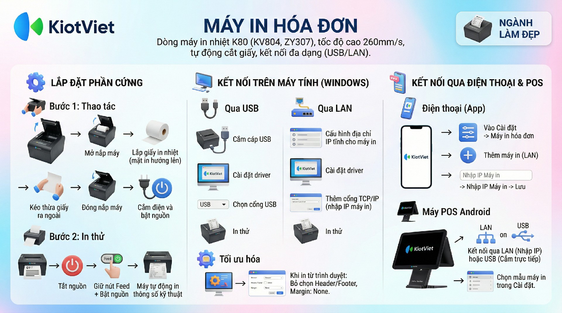 - Linh hoạt trong mô hình vận hành: Giúp quản lý spa/salon lựa chọn phương thức kết nối phù hợp, từ việc kết nối trực tiếp một thiết bị qua USB cho đến việc cho phép nhiều thiết bị (máy tính, máy POS) cùng in qua mạng LAN, tối ưu hóa quy trình làm việc.
