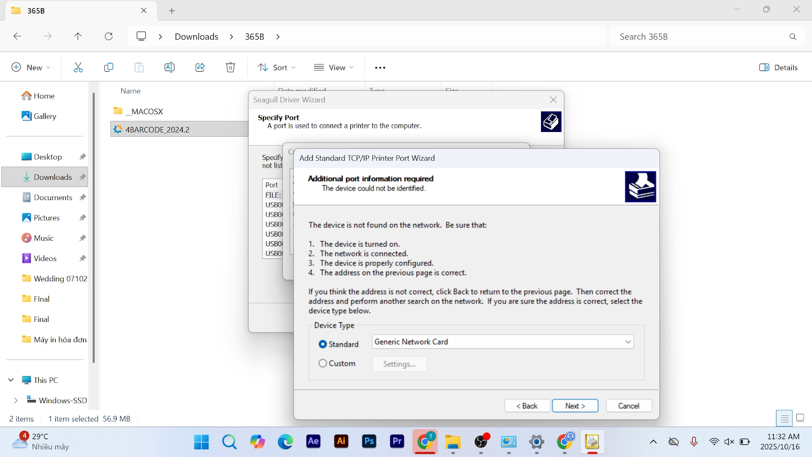 - Tại cửa sổ lựa chọn cách thức kết nối máy in, chọn Network (Ethernet or WIFI), chọn Next, tìm đúng tên mã máy in tem 365B.