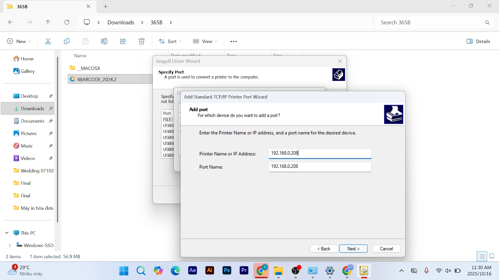 - Chọn Create port…, chọn Stardard TCP/IP Port, chọn Next, điền dải IP đã cố định, chọn Next, chọn Close, chọn Next, điền tên máy in tem mã, chọn Next để hoàn tất thiết lập.