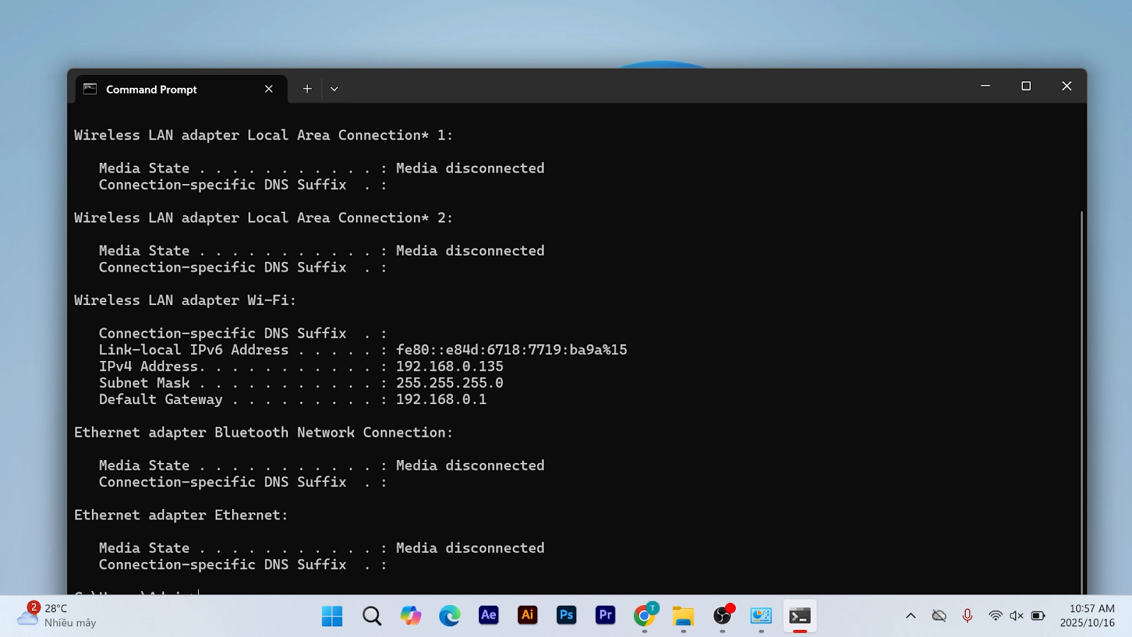 VD: ở trên máy tính bạn bấm Window → gõ CMD → gõ “ipconfig” → bạn tìm đến dòng “Ipv4 Address…” để biết dải IP (Ví dụ: 192.168.0.x) của mạng LAN.