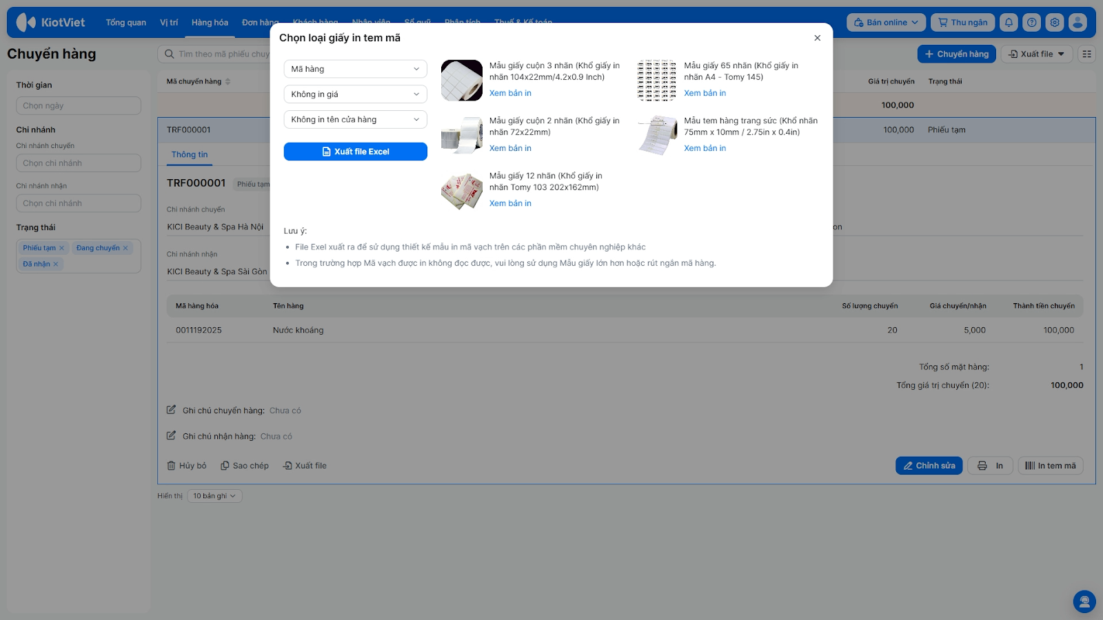 - 1. In mã vạch từ Phiếu Nhập/Chuyển hàng