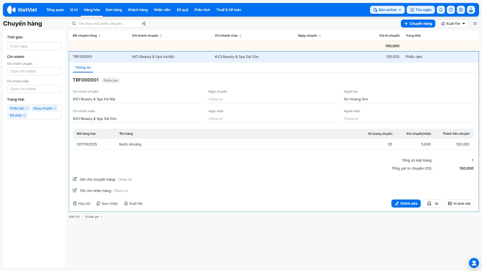 - Từ menu Hàng hóa, vào danh sách Nhập hàng hoặc Chuyển hàng.