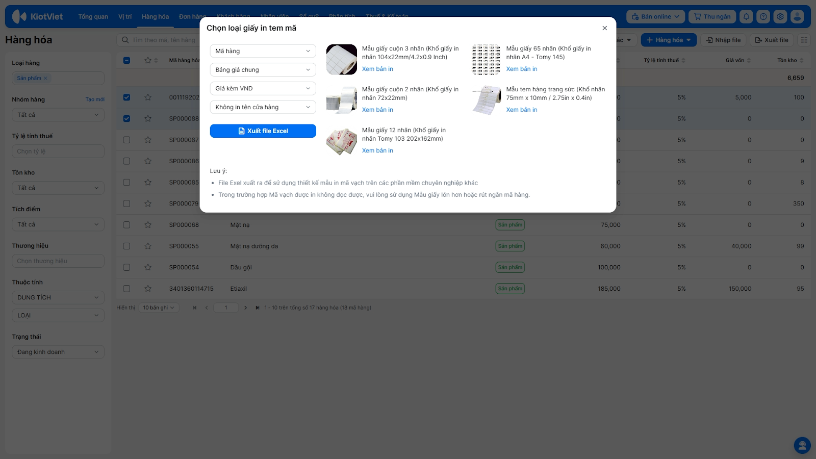 - Chọn thông tin muốn hiển thị trên tem mã (Mã hàng, Bảng giá,…) và chọn khổ giấy (ví dụ: 72 x 22 mm) bạn đã thiết lập → Nhấn Xem bản in.