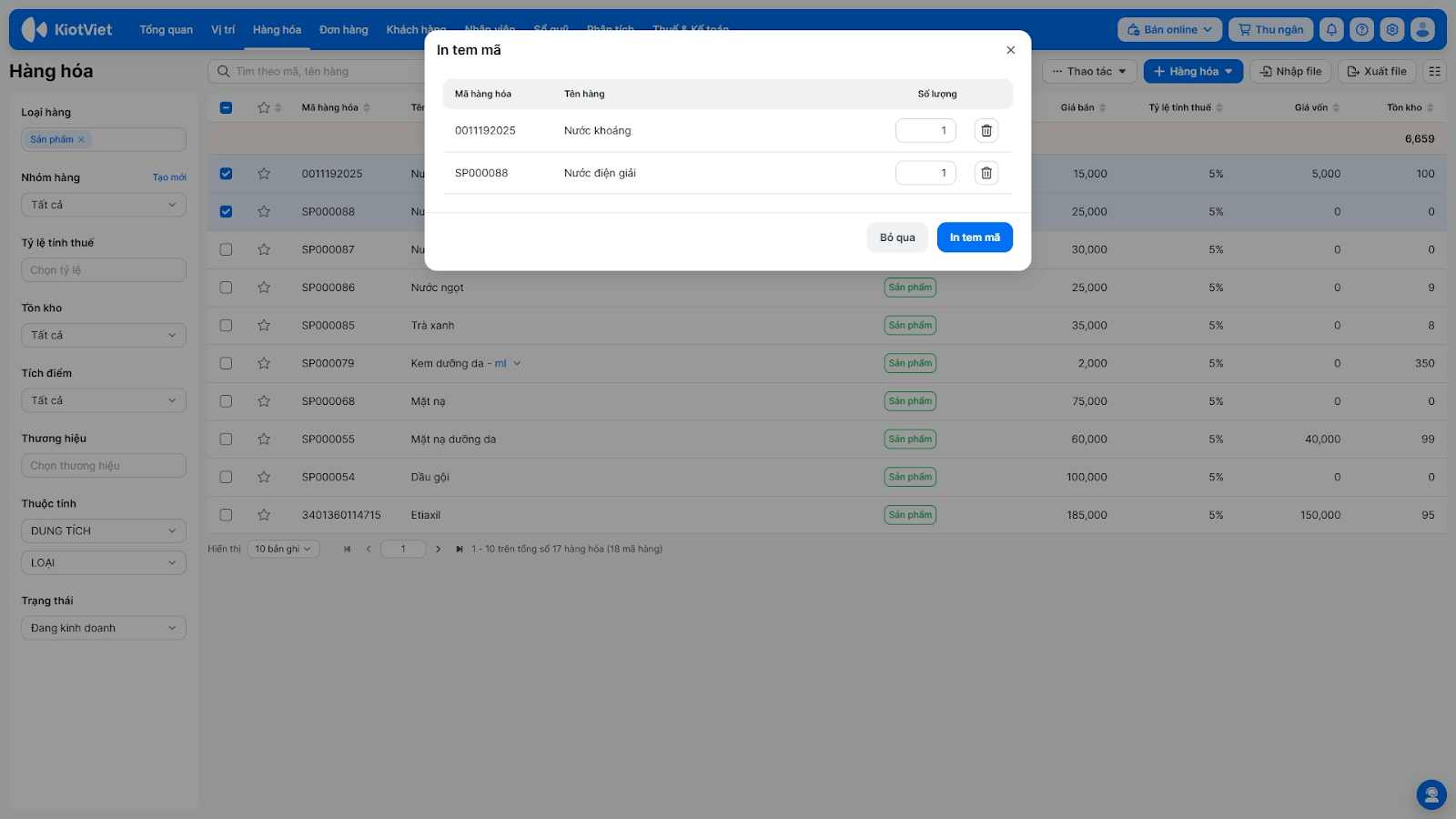 - Nhập số lượng tem cần in cho mỗi sản phẩm và nhấn In tem mã.