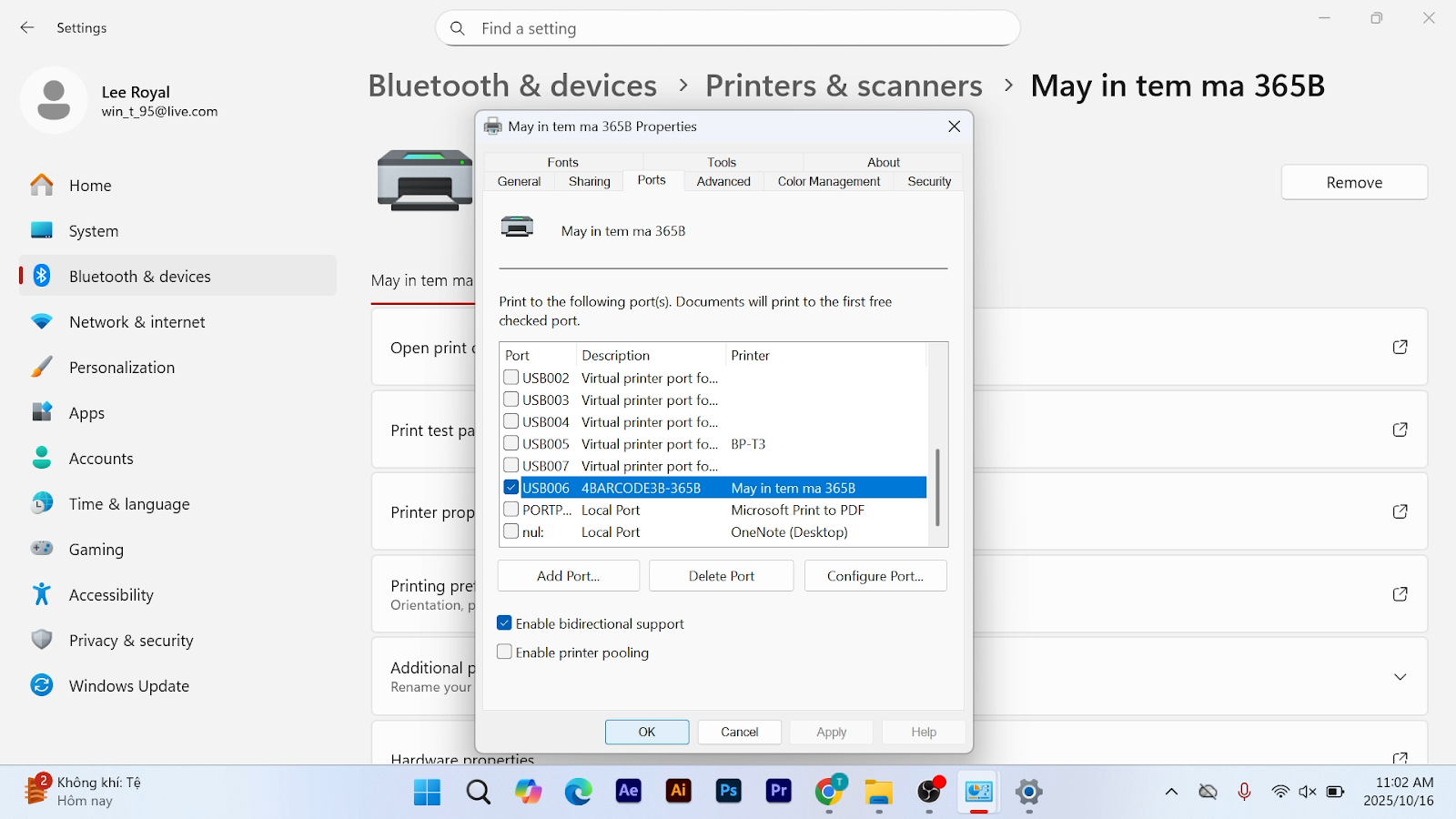 - Để kiểm tra máy in tem mã đã cài đặt thành công. Mở Control Panel trên máy tính và chọn mục View devices and printers. Chọn Printers & Scanners, chọn Máy in tem mã đã cài 4BARCODE 3B-365B, chọn Printer Properties, chọn Ports. Thông tin cổng USB đã kết nối tương ứng với tên mã máy in tem 365B là đã kết nối thành công.
