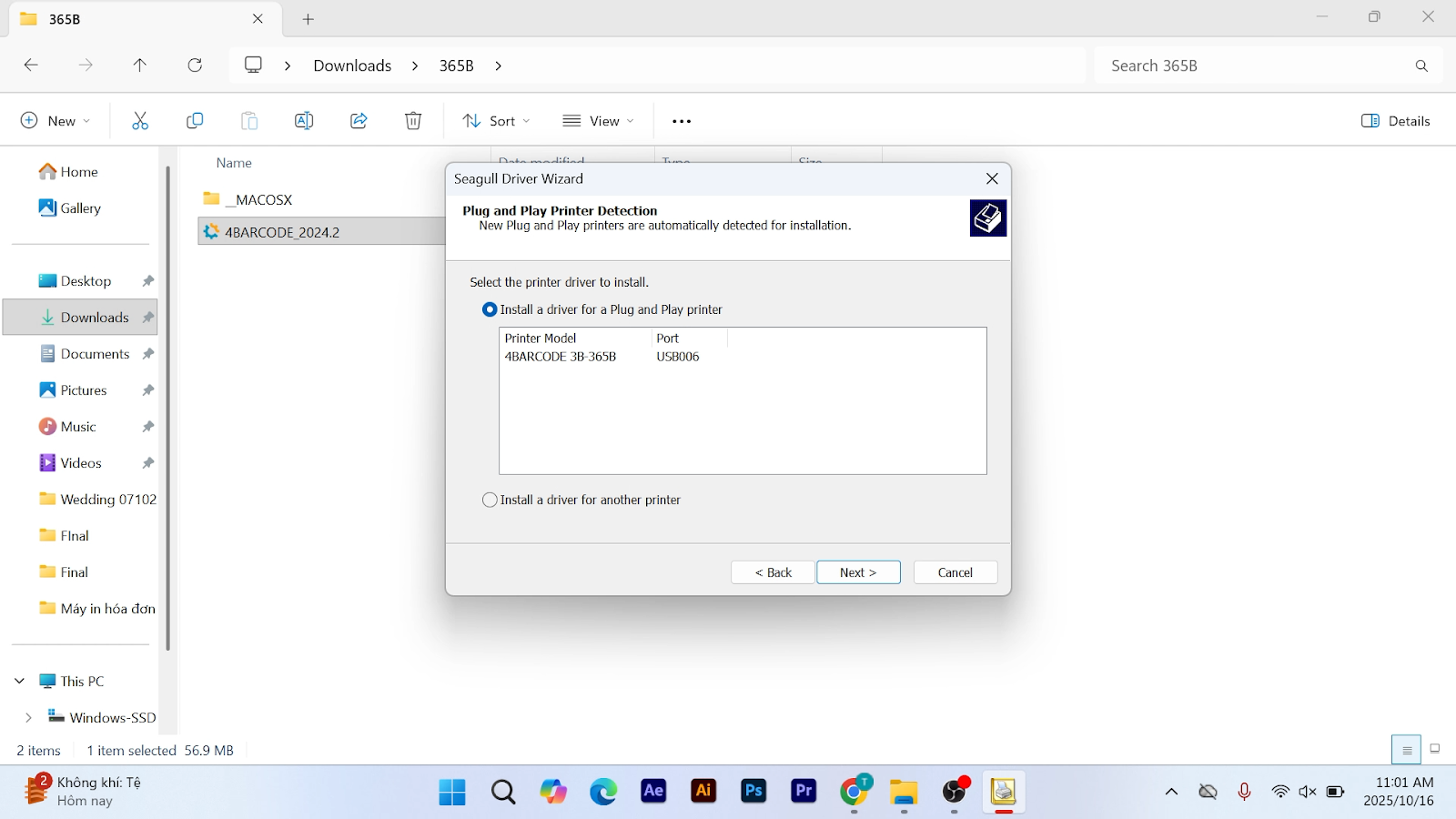 - Hệ thống sẽ tự động dò tìm máy in đã kết nối. Khi thông tin máy in hiện ra, bạn tiếp tục nhấn Next, tiến hành đổi tên máy in tem mã, nhấn Next.
