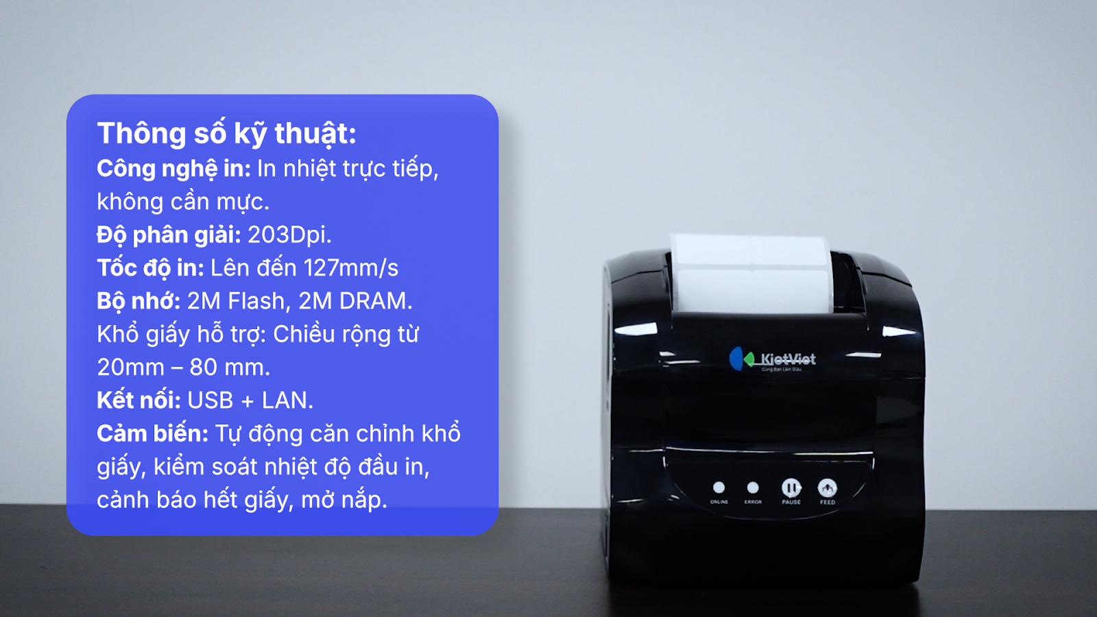- Cảm biến: Tự động căn chỉnh khổ giấy, kiểm soát nhiệt độ đầu in, cảnh báo hết giấy, mở nắp.
