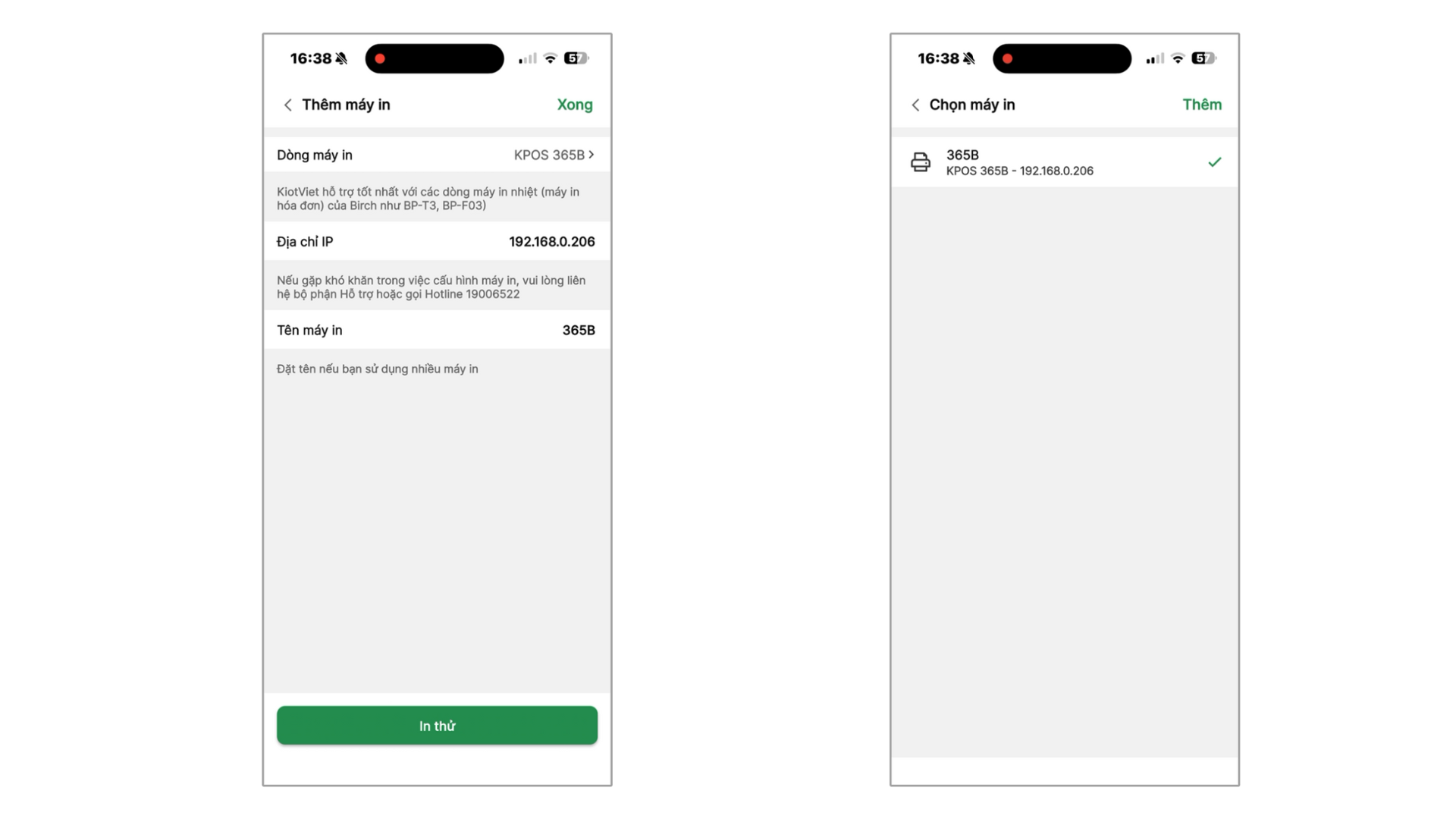 - Tình huống: Sau khi bạn đã cấu hình IP cố định cho máy in, bạn cần thêm máy in này vào ứng dụng KiotViet Salon trên điện thoại.