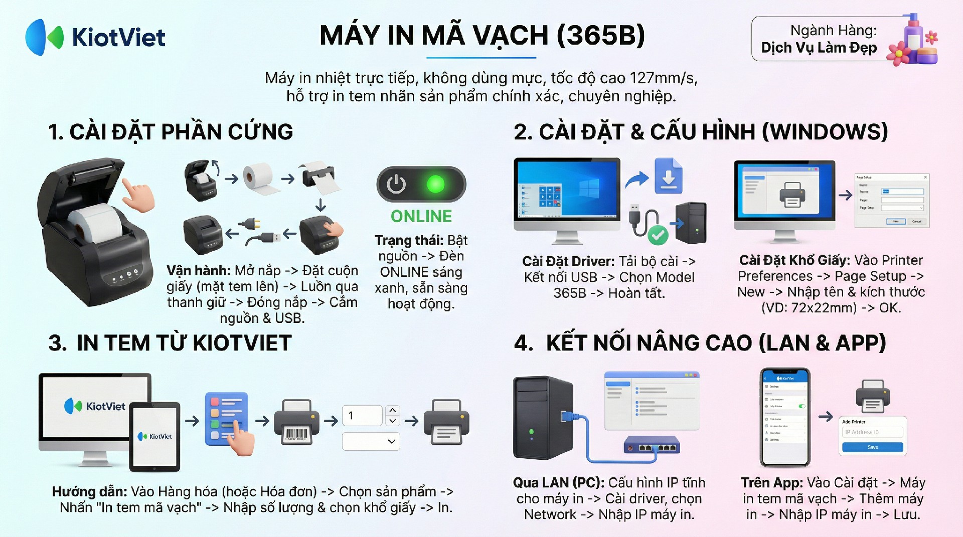 Tài liệu này cung cấp hướng dẫn chi tiết để lắp đặt và thiết lập dòng Máy in tem mã nhiệt 365B phổ biến do KiotViet cung cấp và các dòng máy tương tự. Hướng dẫn sẽ tập trung minh họa trên thiết bị 365B, giúp bạn nhanh chóng tích hợp máy in vào hệ thống quản lý hàng hóa (sản phẩm, mỹ phẩm) của mình.