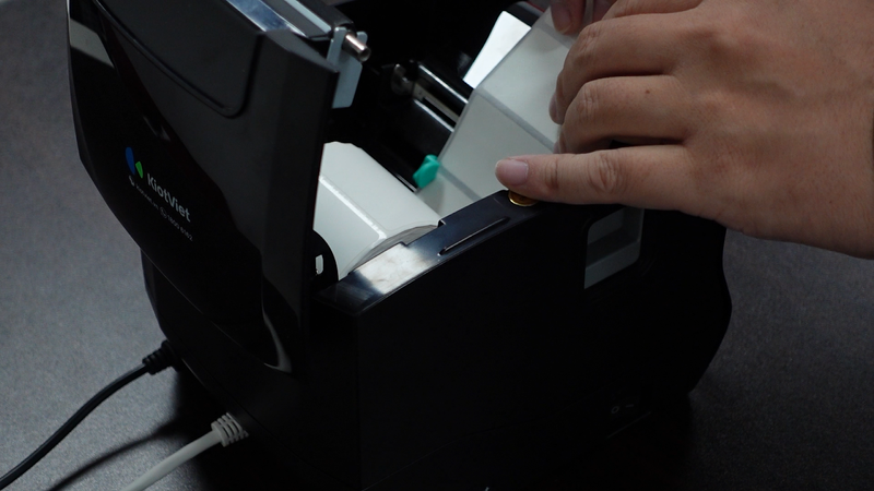 - Đặt cuộn giấy vào thanh đỡ bên trong, sao cho mặt tem hướng lên trên.