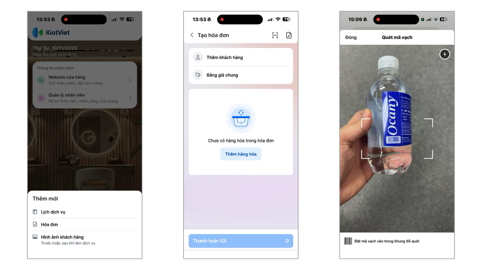 - Giải pháp: Ứng dụng KiotViet Salon trên điện thoại được tích hợp sẵn tính năng quét mã vạch bằng camera của máy. Bạn không cần kết nối với máy quét vật lý. Chỉ cần chọn biểu tượng mã vạch trên ứng dụng và hướng camera về phía sản phẩm để quét.