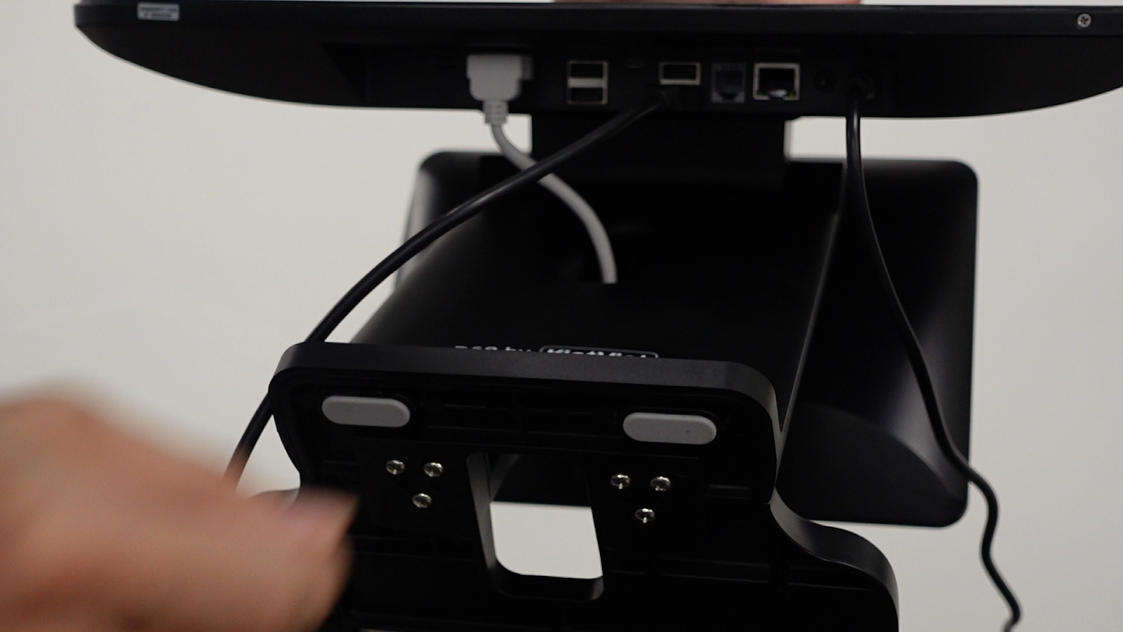- Kết nối một đầu dây cáp (đầu giống cổng mạng RJ-45) vào phía dưới của đầu đọc mã vạch.
