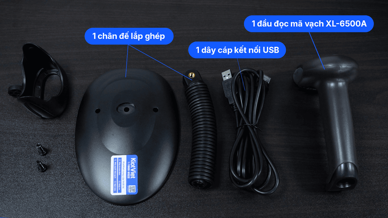 - Tình huống: Khi bạn vừa nhận bộ sản phẩm máy quét mã vạch và cần lắp ráp chân đế để sử dụng tại quầy lễ tân.