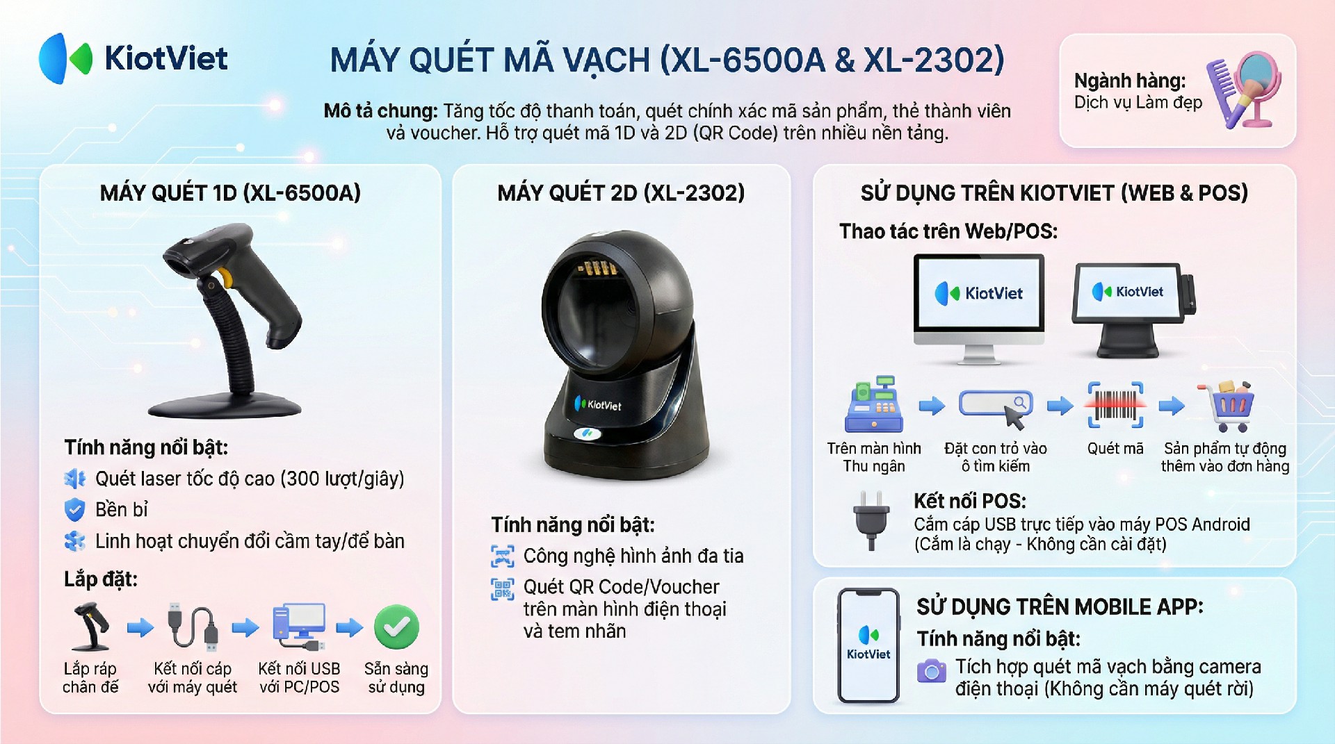- Tăng tốc độ thanh toán: Giúp nhân viên lễ tân/thu ngân xử lý hóa đơn nhanh chóng chỉ với một thao tác quét (với các sản phẩm bán lẻ có mã vạch như dầu gội, mỹ phẩm, hoặc thẻ liệu trình), giảm thiểu thời gian chờ đợi của khách hàng.