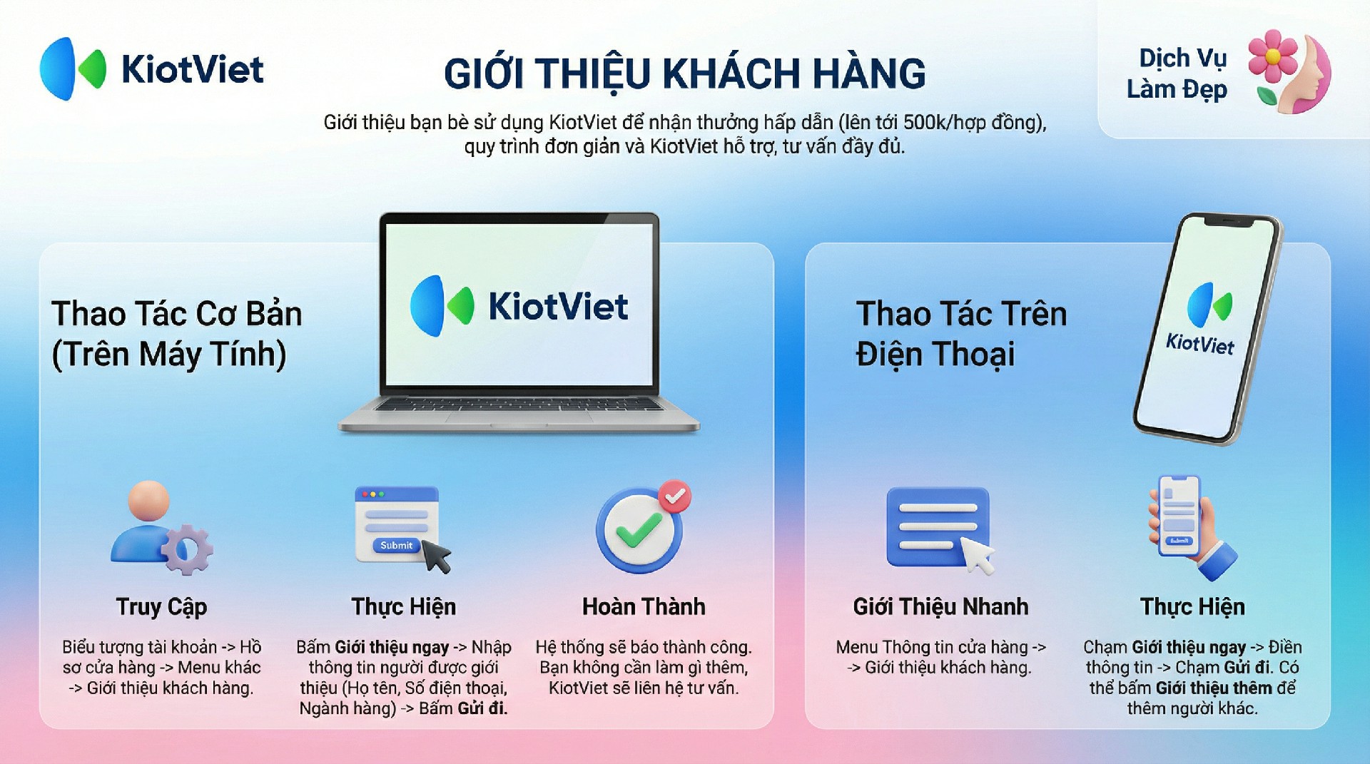 Tính năng này cho phép các khách hàng đang sử dụng KiotViet giới thiệu khách hàng mới và nhận thưởng lên đến 500,000đ khi người được giới thiệu ký hợp đồng thành công. Bạn chỉ cần điền thông tin, KiotViet sẽ đảm nhận việc liên hệ và tư vấn.