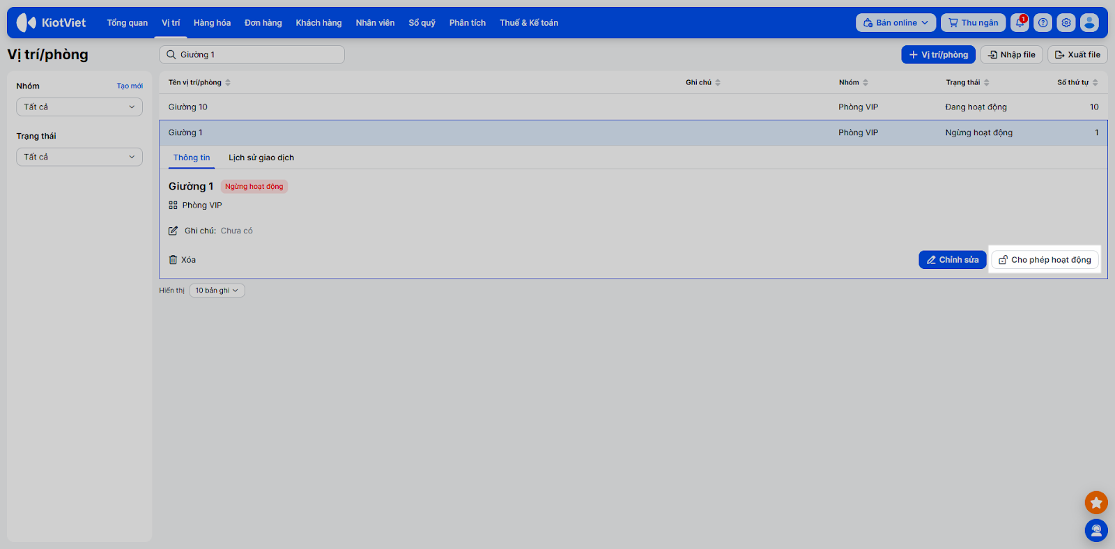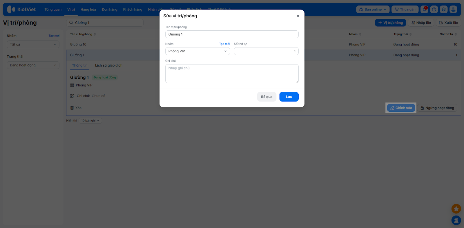- Trên màn hình Vị trí/phòng, chọn vị trí/phòng cần sửa.