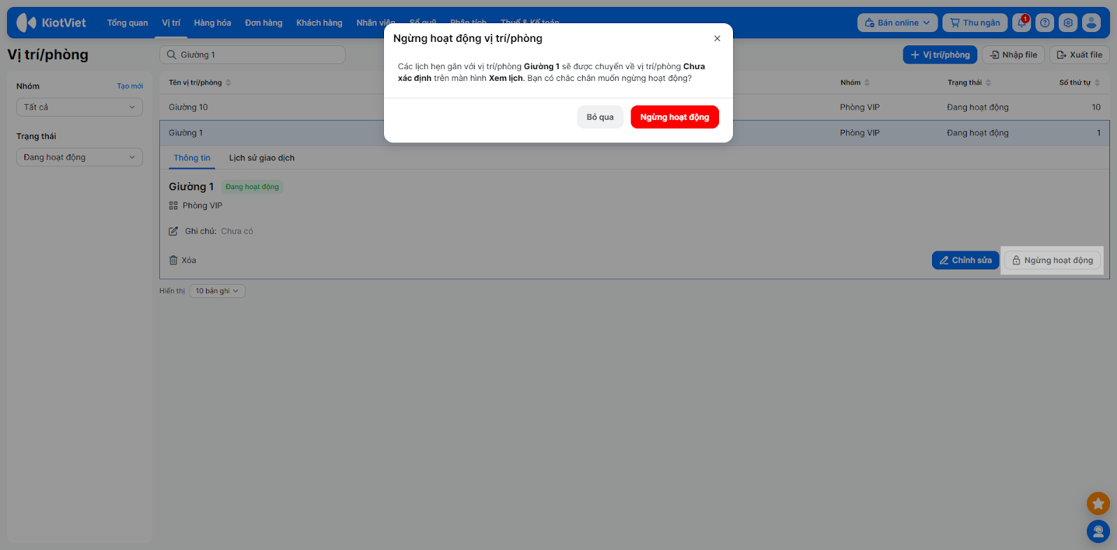Lưu ý: Sau khi ngừng hoạt động, các lịch hẹn đã trót xếp vào giường này sẽ tự động chuyển sang cột Chưa xác định trên màn hình Lịch hẹn để bạn sắp xếp lại vị trí mới.