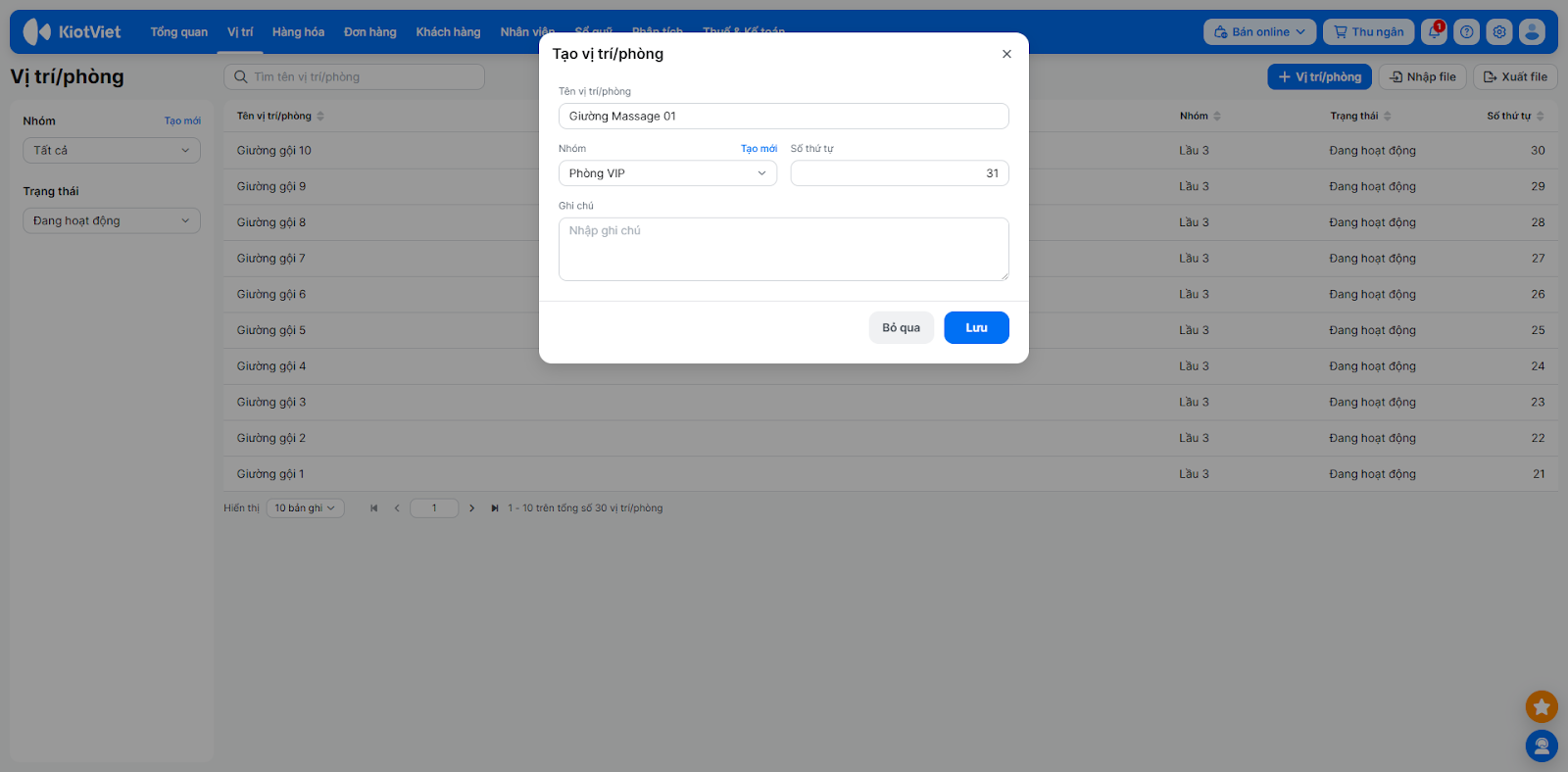 - Tên vị trí/phòng: (Bắt buộc) Ví dụ: Giường Massage 01, Ghế Nail 03.