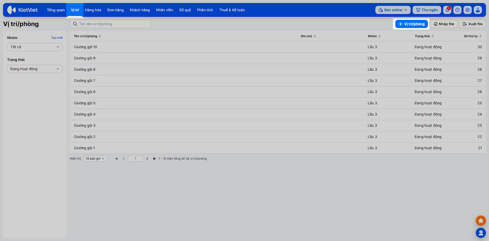 - Tại màn hình Quản lý, bạn chọn Vị trí → nhấn nút + Vị trí/phòng.
