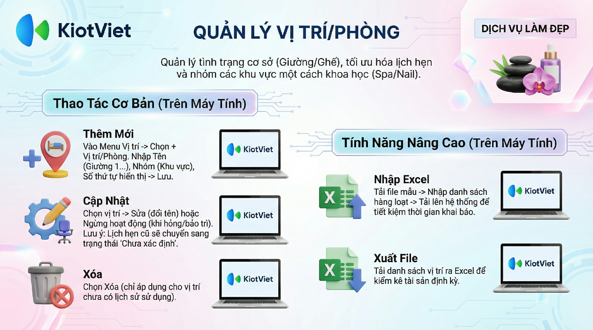- Phân loại khoa học: Hỗ trợ phân nhóm vị trí theo khu vực (Khu gội, Phòng VIP, Khu làm móng) để dễ quản lý.
