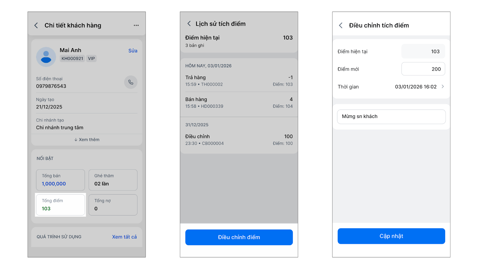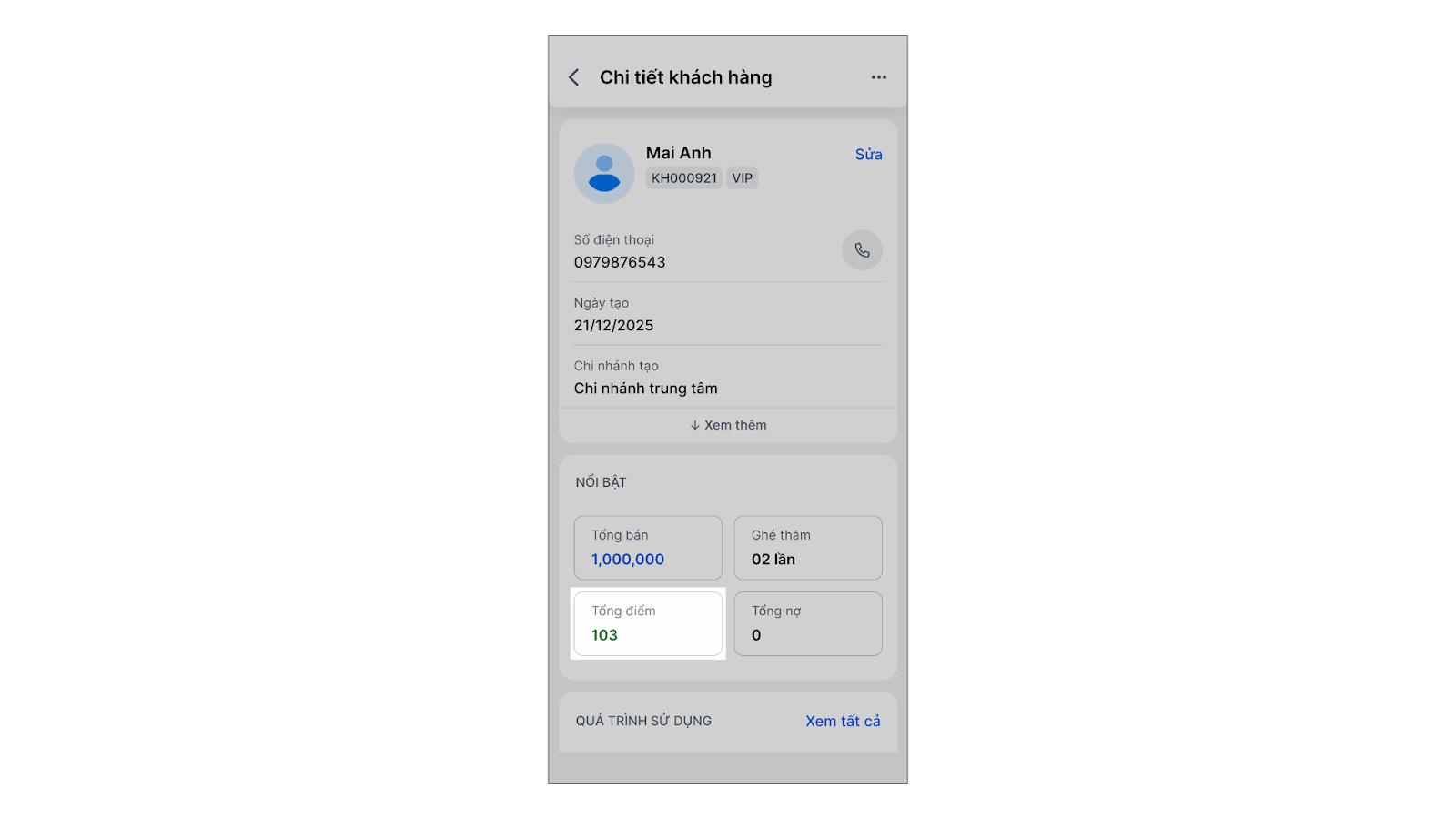 - Tại màn hình chi tiết khách hàng, chạm Tổng điểm.