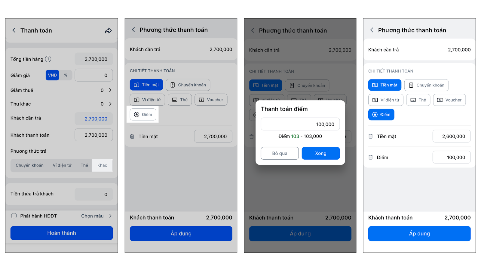 - Chọn Điểm → nhập số tiền muốn dùng → nhấn Xong.