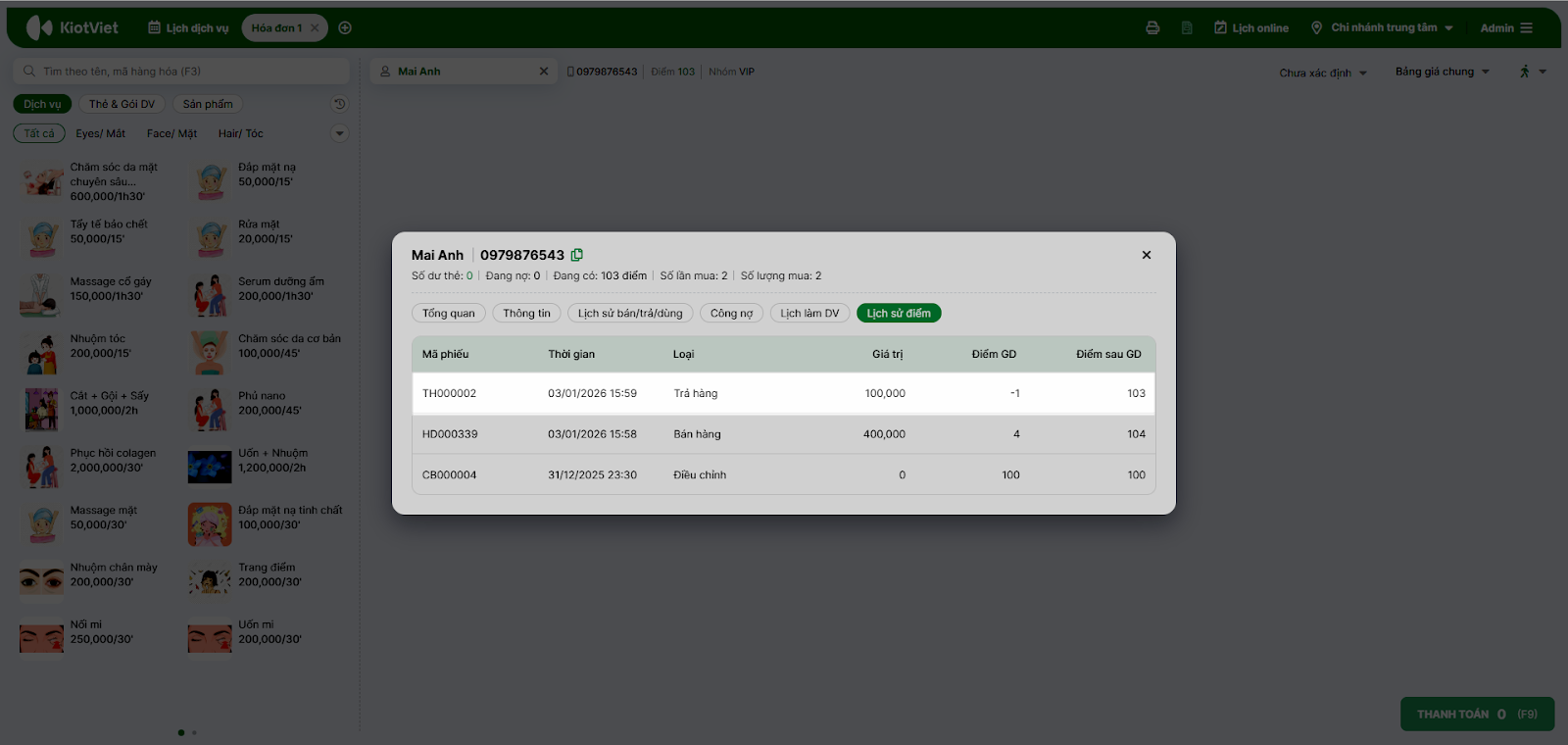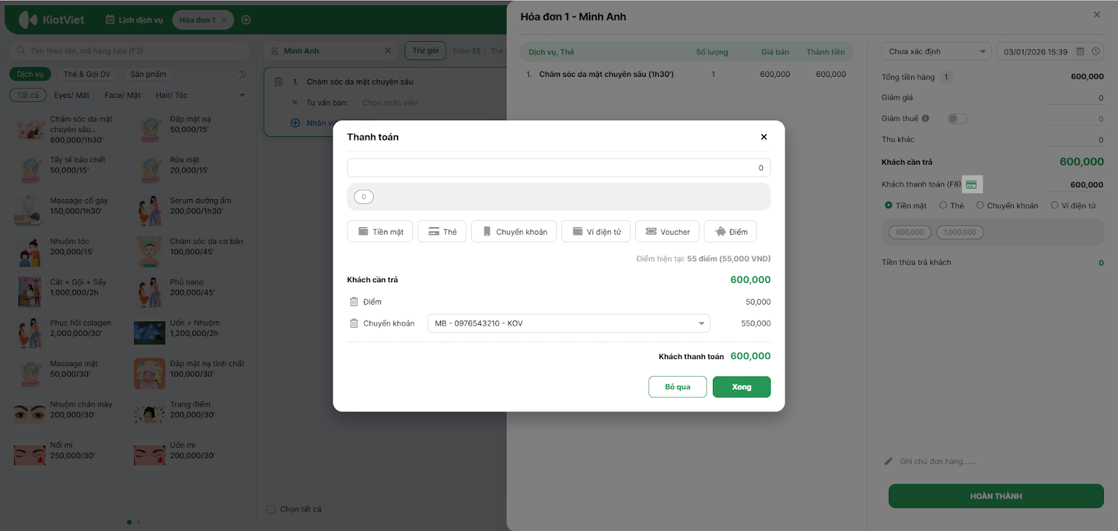 - Tình huống: Khách có 55 điểm (tương đương 55,000) và muốn dùng để trừ vào hóa đơn hết 600,000.