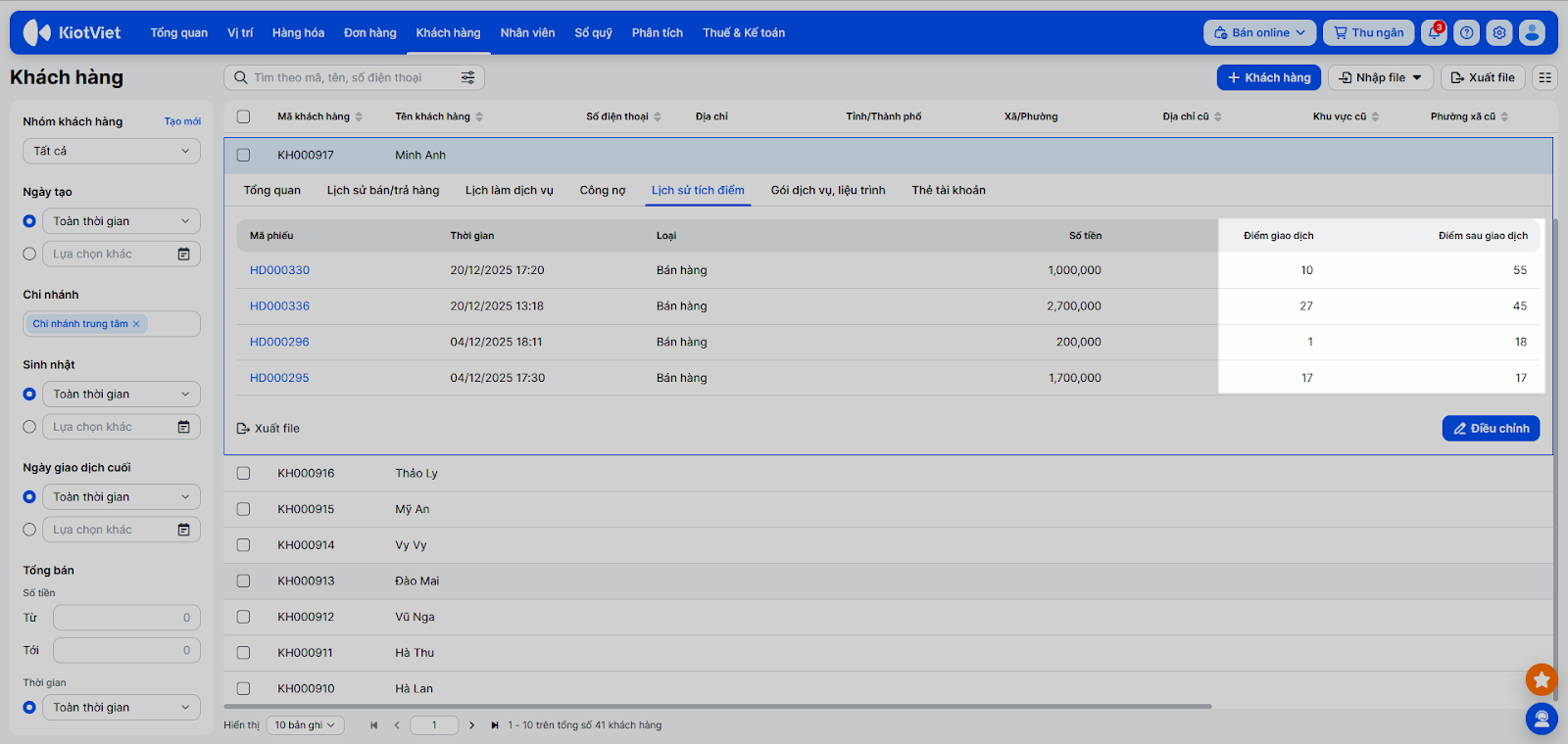 - Tìm và chọn tên khách hàng → vào tab Lịch sử tích điểm.
