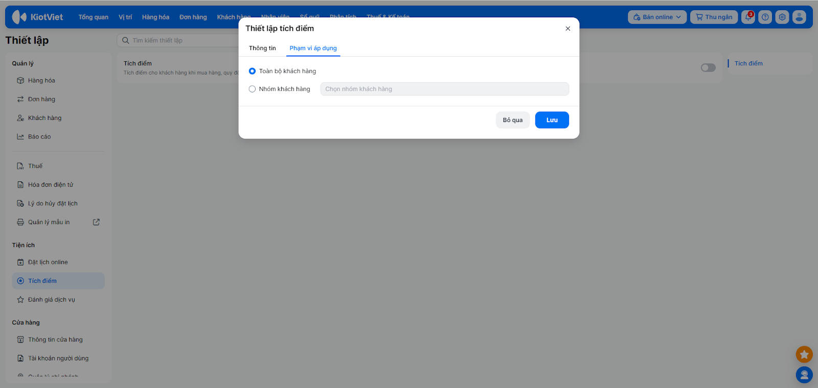 Lưu ý: Cần được phân quyền “Cập nhật tích điểm” mới thực hiện được thao tác này.